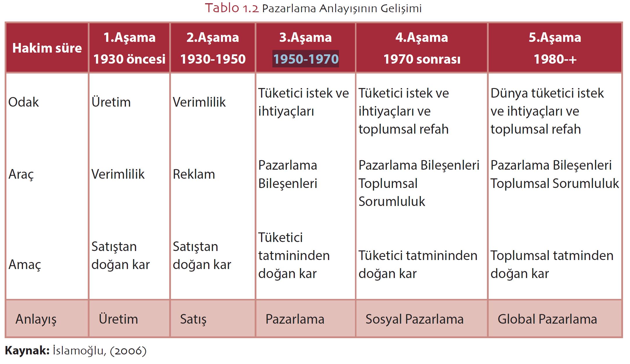 İlk olarak dikkate alınan pazarlama anlayışının dönemsel gelişimi Tablo 1.2’de görülmektedir. 1900’lü yılların başındaki üretim anlayışı olarak adlandırılan ilk aşama, 1930 yılı öncesini kapsamaktadır. Bu dönemde arz-talep dengesinin olmadığı, müşteri bulma önceliğinin ilk sırada yer almadığı, 1. Dünya Savaşı ve 1929 Ekonomik Buhranı’nın yaşandığı, üretimde kıtlığın görüldüğü, üretim odaklı ve verimliliğin artırılmasının öncelikli olduğu, satıştan doğan karın amaçlandığı görülmektedir.