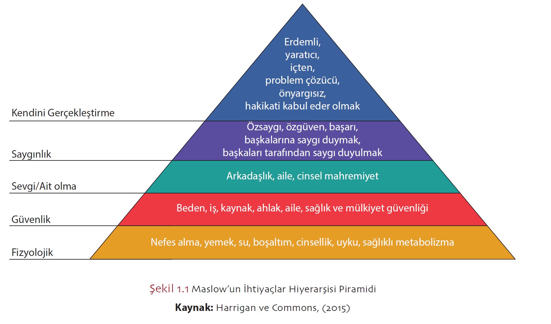 Piramitte ihtiyaçların beş kademede öncelik sıralaması görülmektedir. Bunlar, öncelikle fizyolojik ihtiyaçlar (nefes alma, yemek, içmek, barınma gibi), ikinci aşamada güvenlik ihtiyaçları (beden, iş, kaynak, ahlak, aile, sağlık ve mülkiyet güvenliği), üçüncü aşamada ait olma, sevgi, ait olma ihtiyaçlar (arkadaşlık, aile), saygınlık gereksinimi (öz saygı, öz güven, başarı, başkalarına saygı duymak, başkaları tarafından saygı duyulmak) ve kendini gerçekleştirme gereksiniminden (erdemli, yaratıcı, içten, problem çözücü, önyargısız ve hakikatleri kabul eder olmak) meydana gelmektedir.