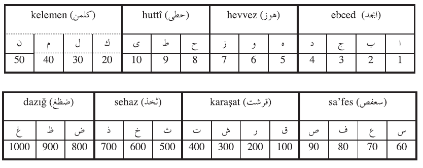 Arap alfabesindeki her harfin bir sayı değeri vardır. Bu nedenle Arap alfabesinin bilinen sırası dışında sayısal değerleri esas alınarak yapılmış bir başka sıralaması daha vardır. Ebced elifbâsı adı verilmiş olan bu sıralamada günümüzde kullanılan Arap alfabesinde olduğu gibi harflerin şekil benzerlikleri değil, sayısal değerleri esas alınmıştır. Söz konusu alfabedeki harflerin bu sıralanışından sekiz anlamsız sözcük doğmuştur. Bu sözcükler ebced, hevvez, huttî, kelemen, sa’fes, karaşat, sehaz ve dazığdır. Bu sözcüklerin alfabenin ve bunların sayısal karşılıklarının akılda kalmasını kolaylaştırmak amacıyla uydurulmuş sözcükler olduğu anlaşılmaktadır. Her harfin küçükten büyüğe doğru sıralandığı sekiz sözcük ve bu sözcüklerdeki harflerin sayısal olarak karşılıkları şunlardır:
