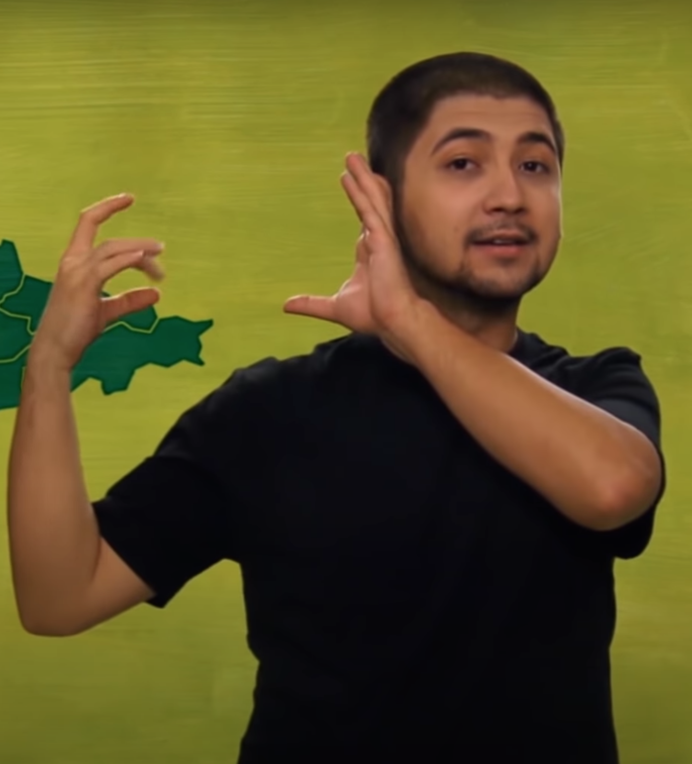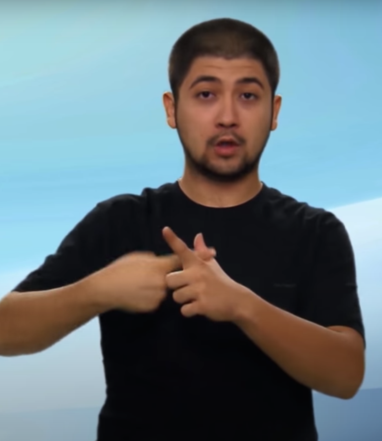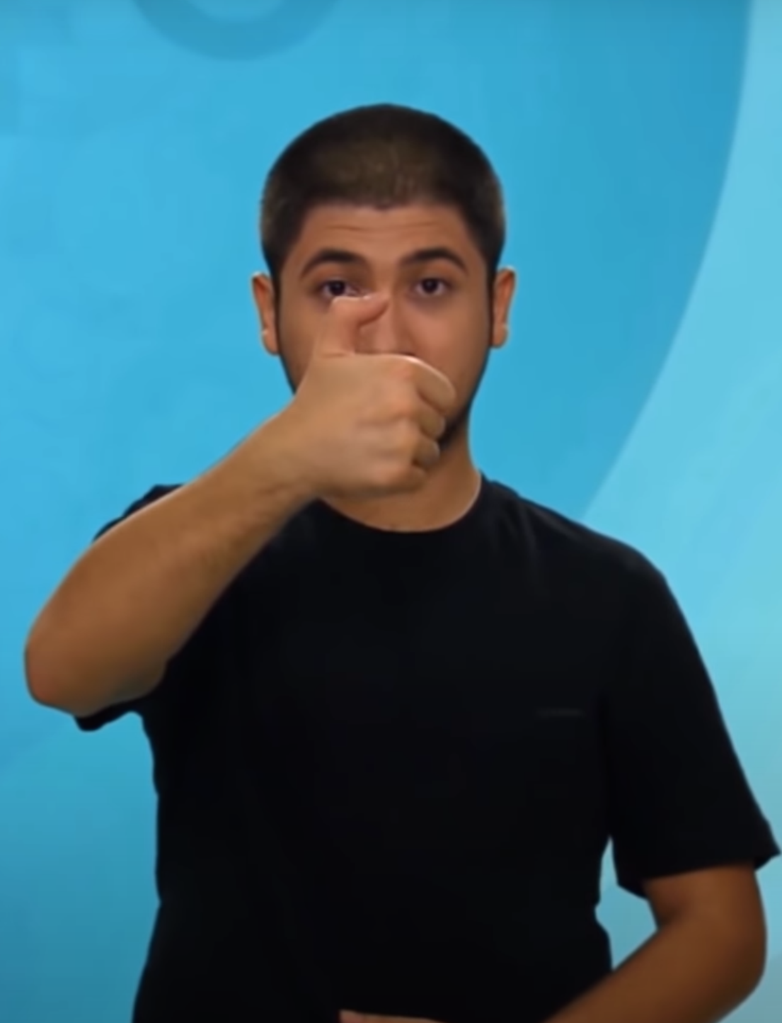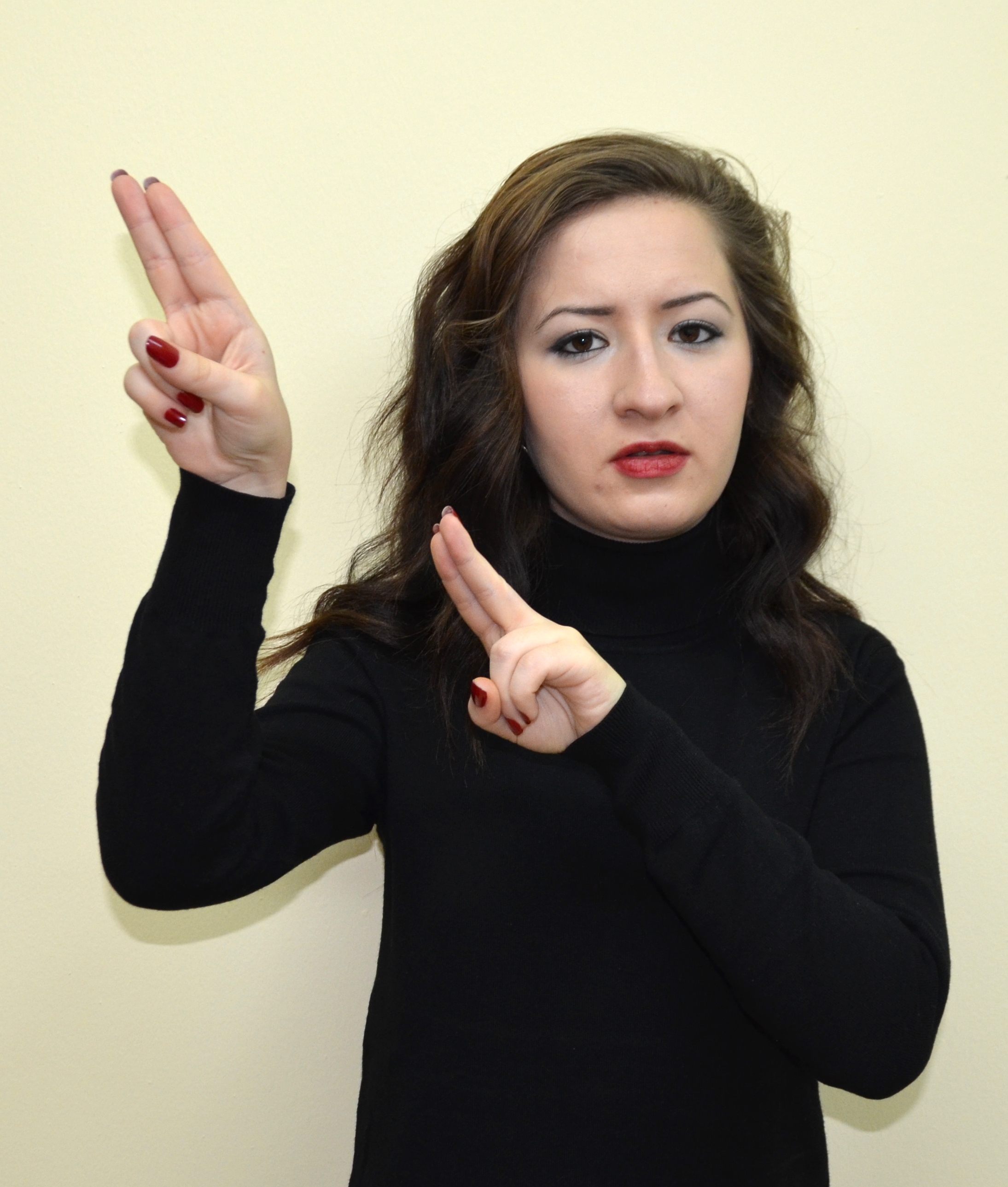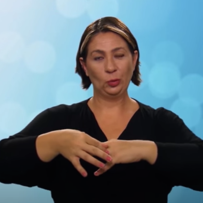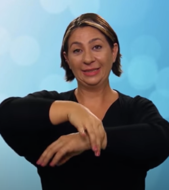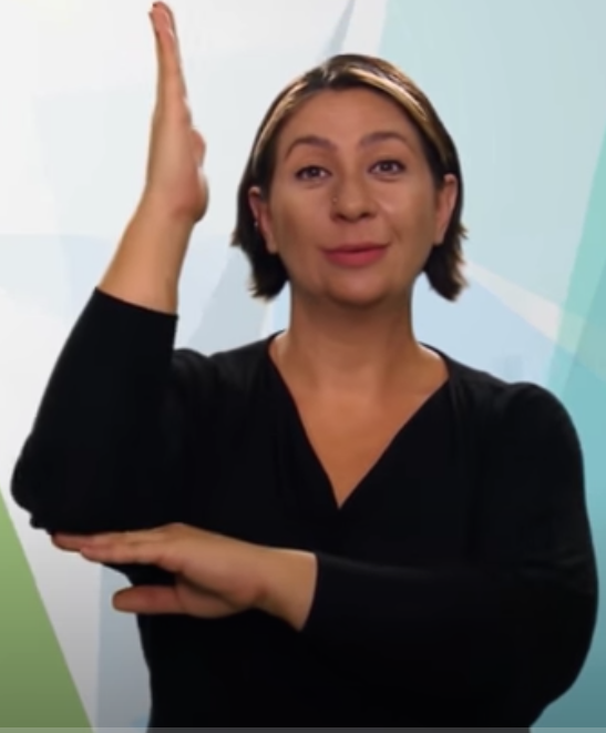“İki elin işaret parmağı açık ve düz, diğer parmaklar kapalıdır. Sol elin işaret parmağı göğüs hizasından sağ elin işaret parmağının ucuna dokundurulup sola yana doğru hareket eder.”