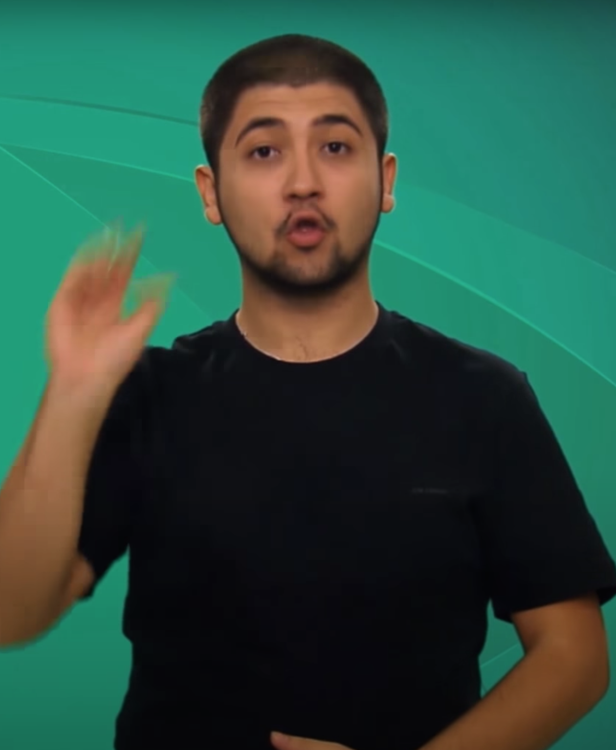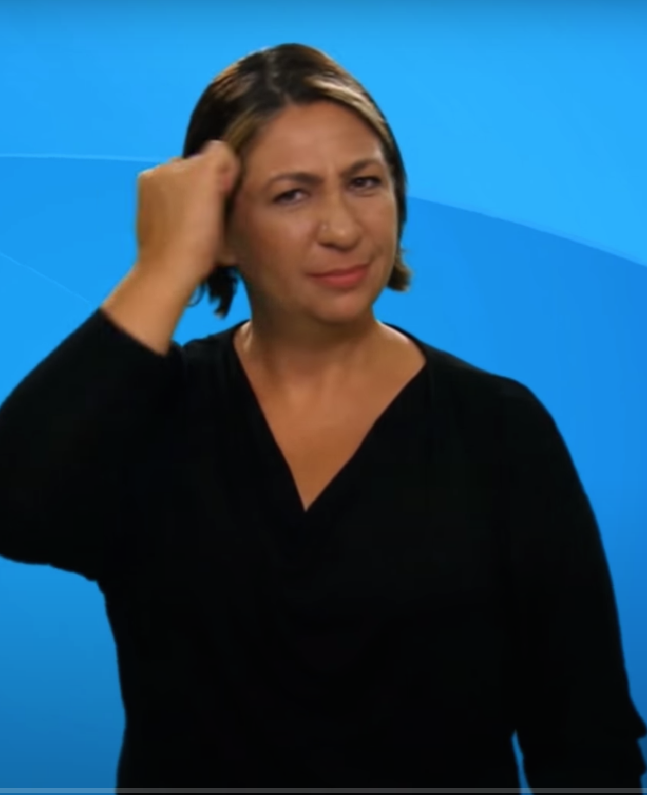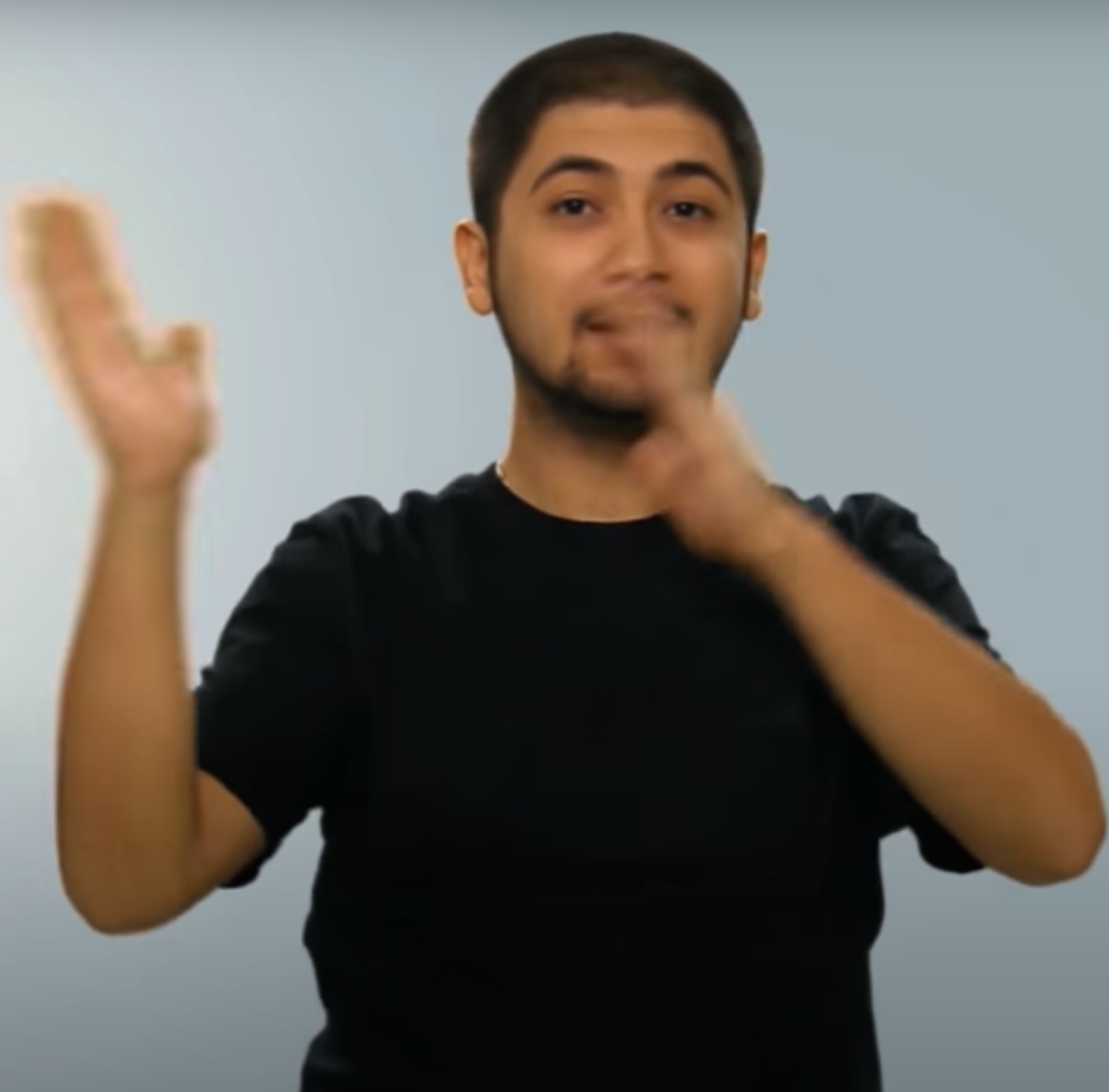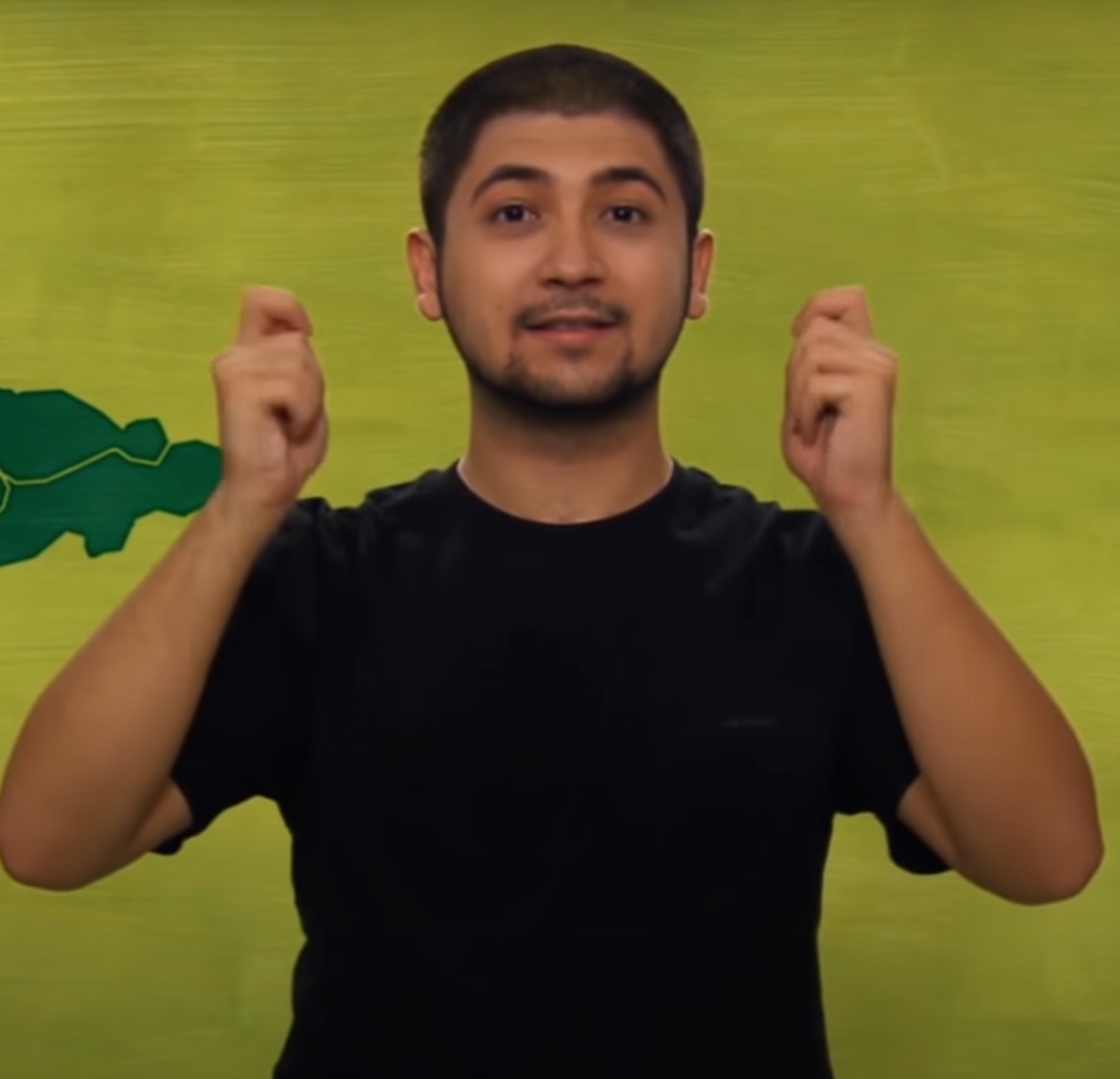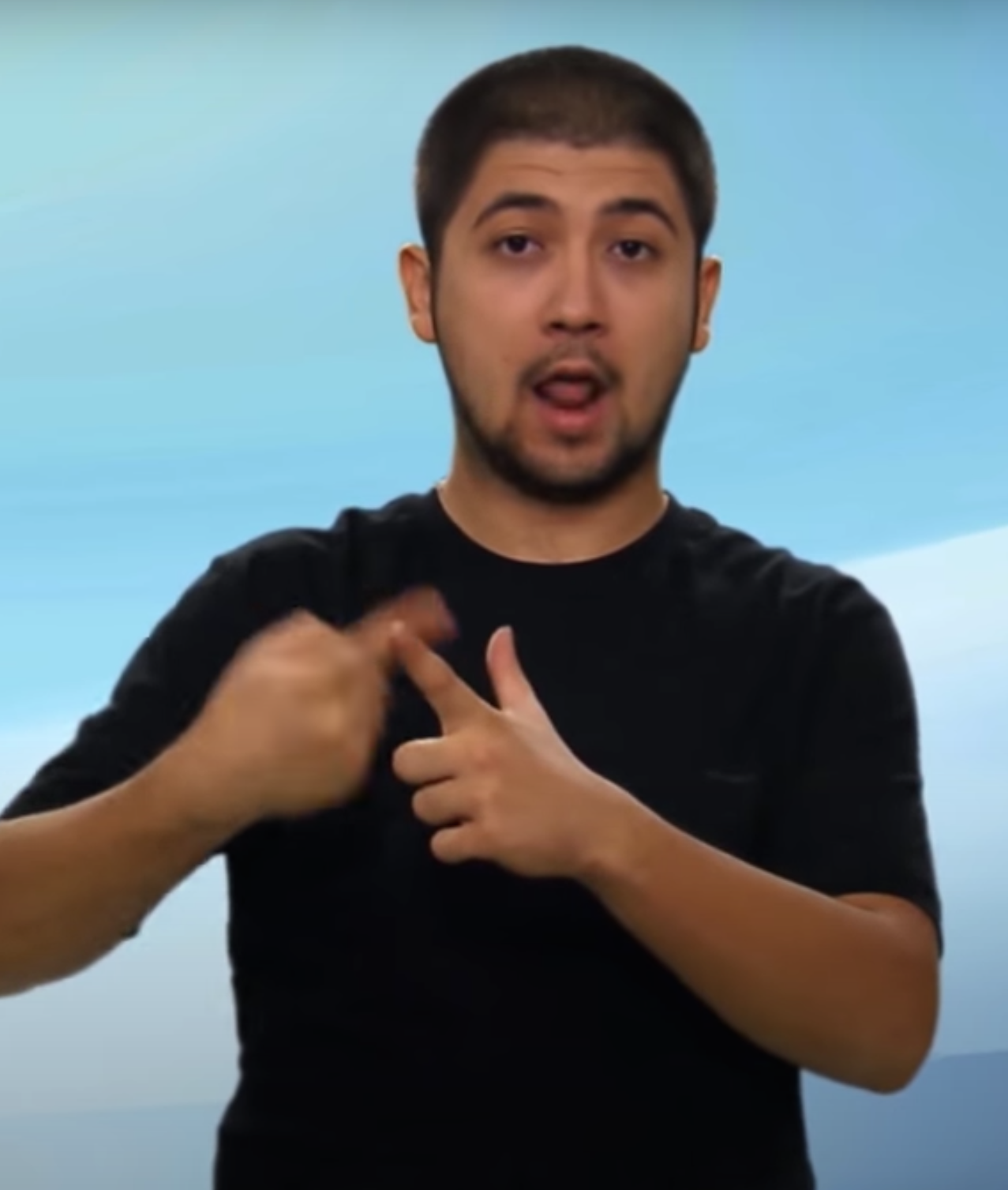 “İki elin işaret parmağı açık ve düz, diğer parmaklar kapalıdır. Sol elin işaret parmağı göğüs hizasından sağ elin işaret parmağının ucuna dokundurulup sola yana doğru hareket eder.”