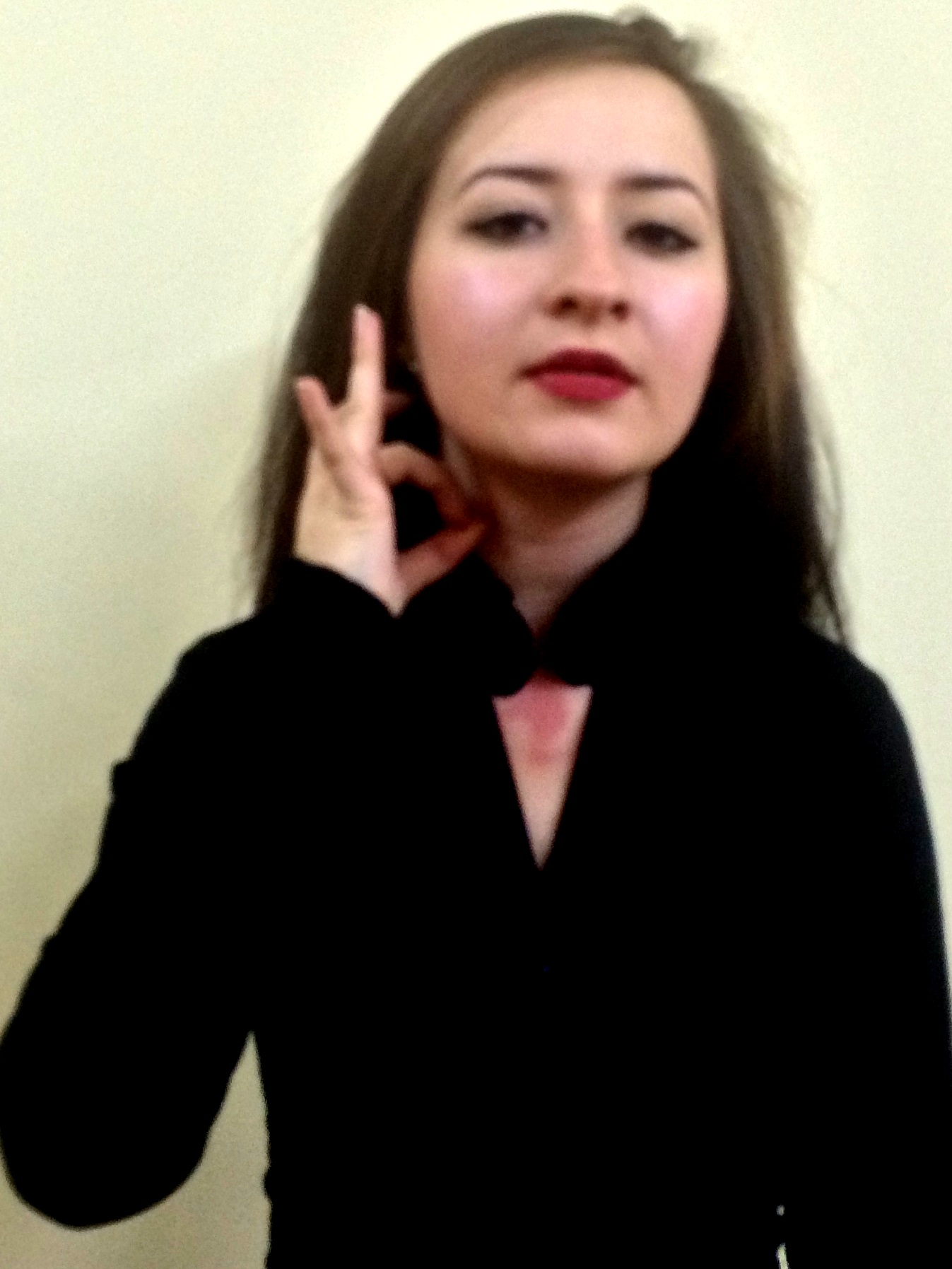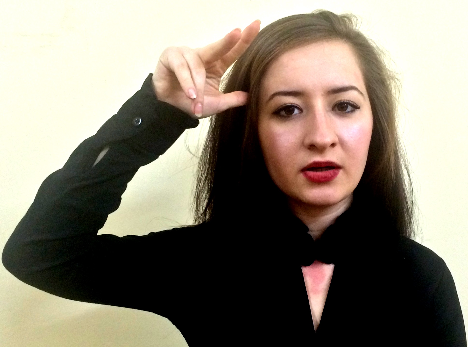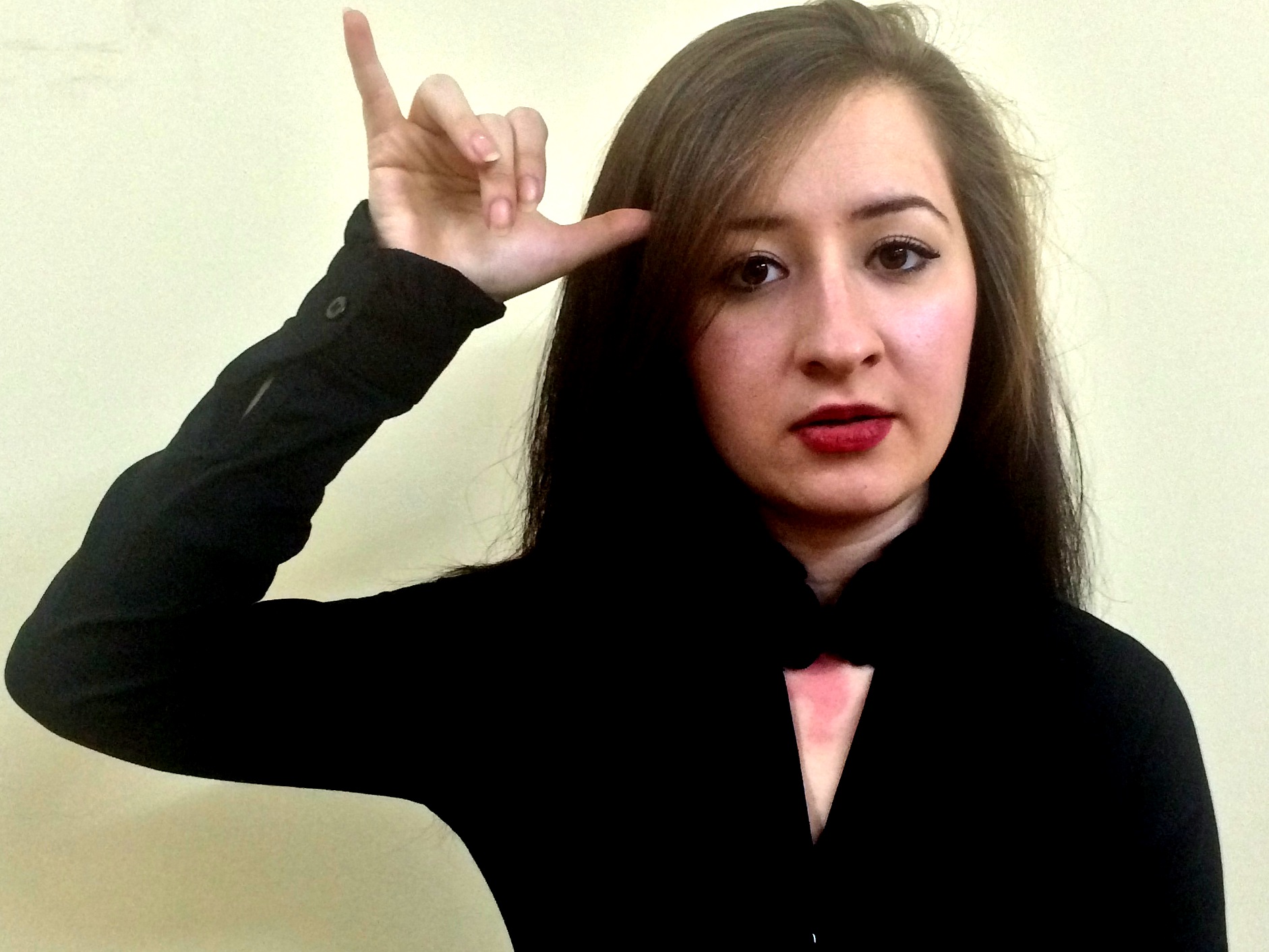 Sağ el işaret parmağı açık, işaret parmağı ile başa dokunulur. Ardından sağ el yumruk biçiminde, işaret parmağı öne doğru çıkıntılı ve başparmakla bitişik, öbür parmaklar kapalıdır. Sağ elin baş ve işaret parmakları bir şey tutar gibi ileride öne doğru hareket eder.