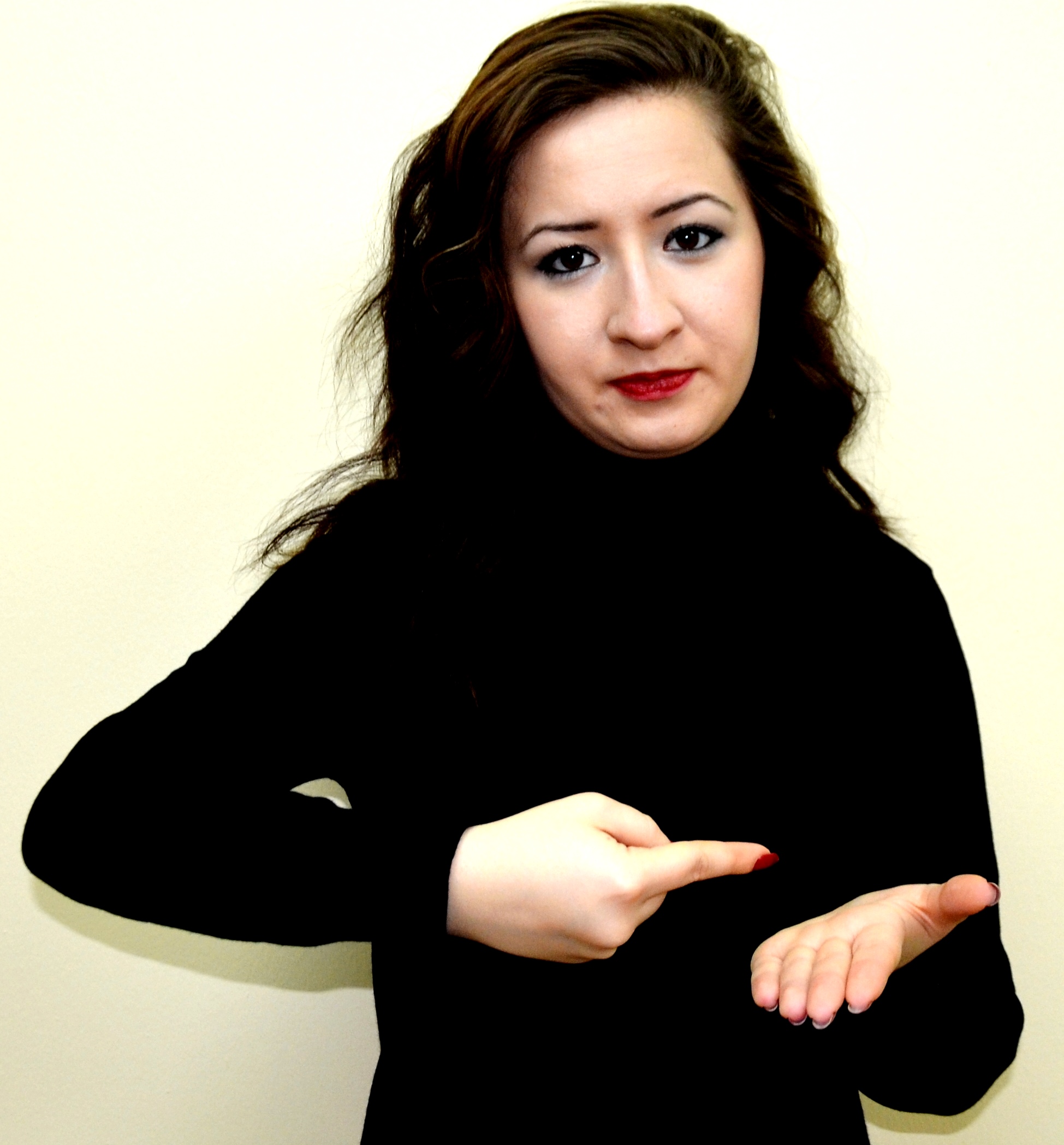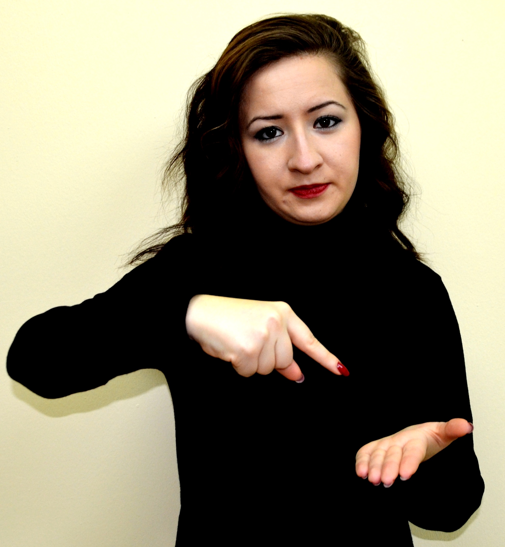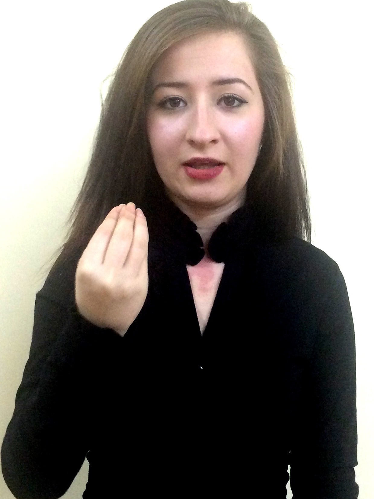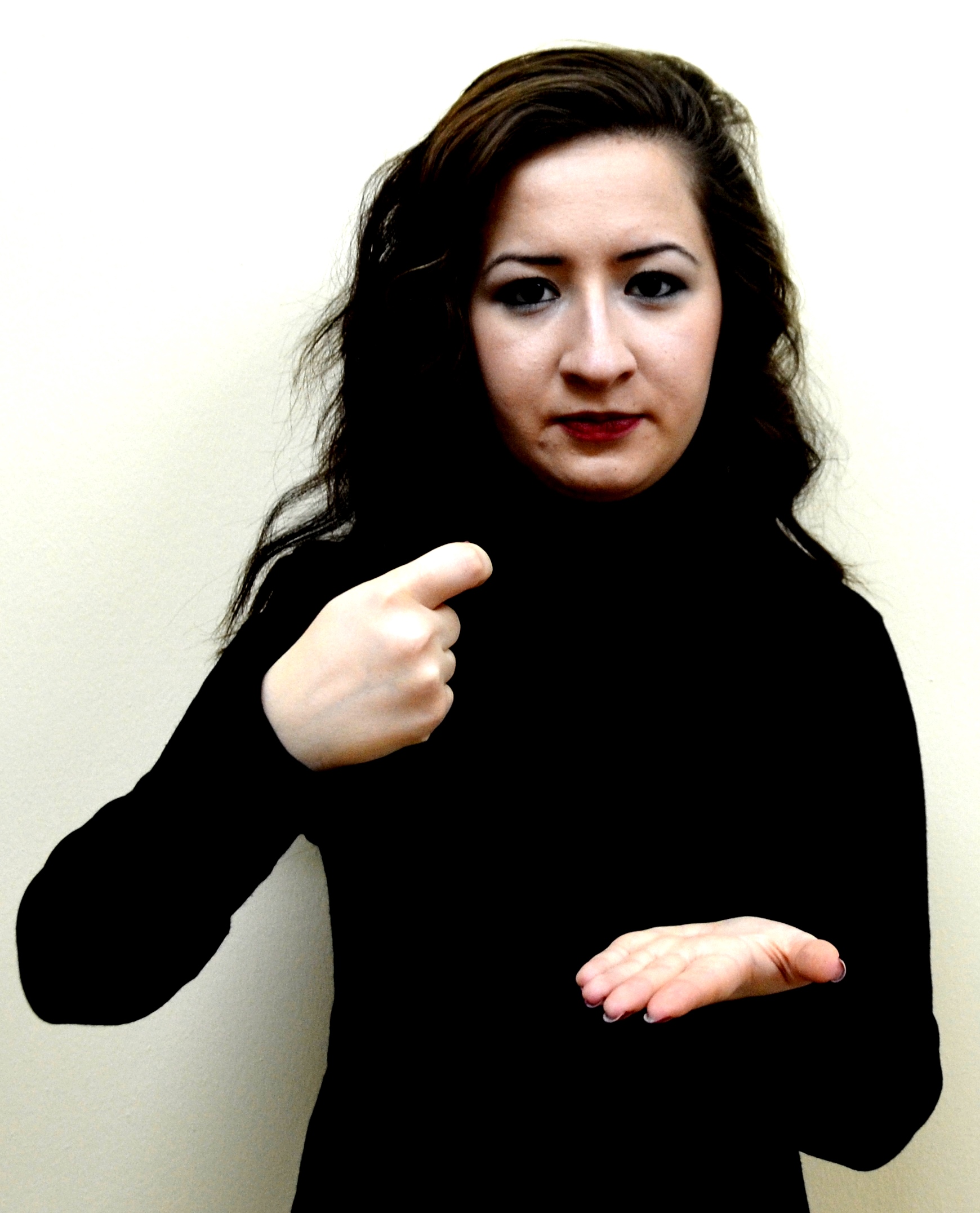 İki el göğüs hizasındadır. Sağ elin işaret parmağı açık, öbür parmakları kapalıdır. Sol el düz, avuç içi sağa bakacak şekilde tutulur. Sağ elin işaret parmağı, sol avuç içine dokunarak parmak uçlarına doğru hareket ettirilir.