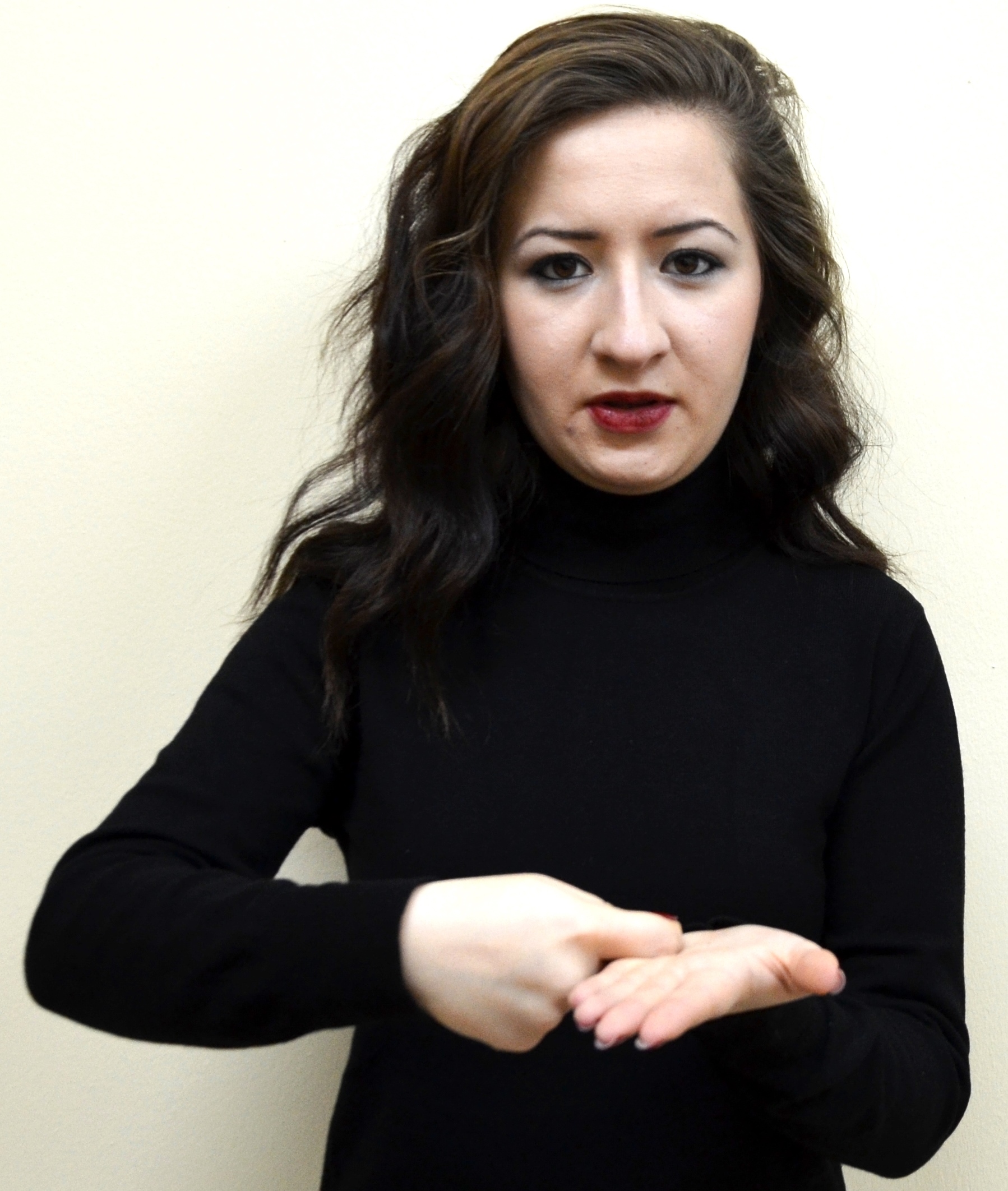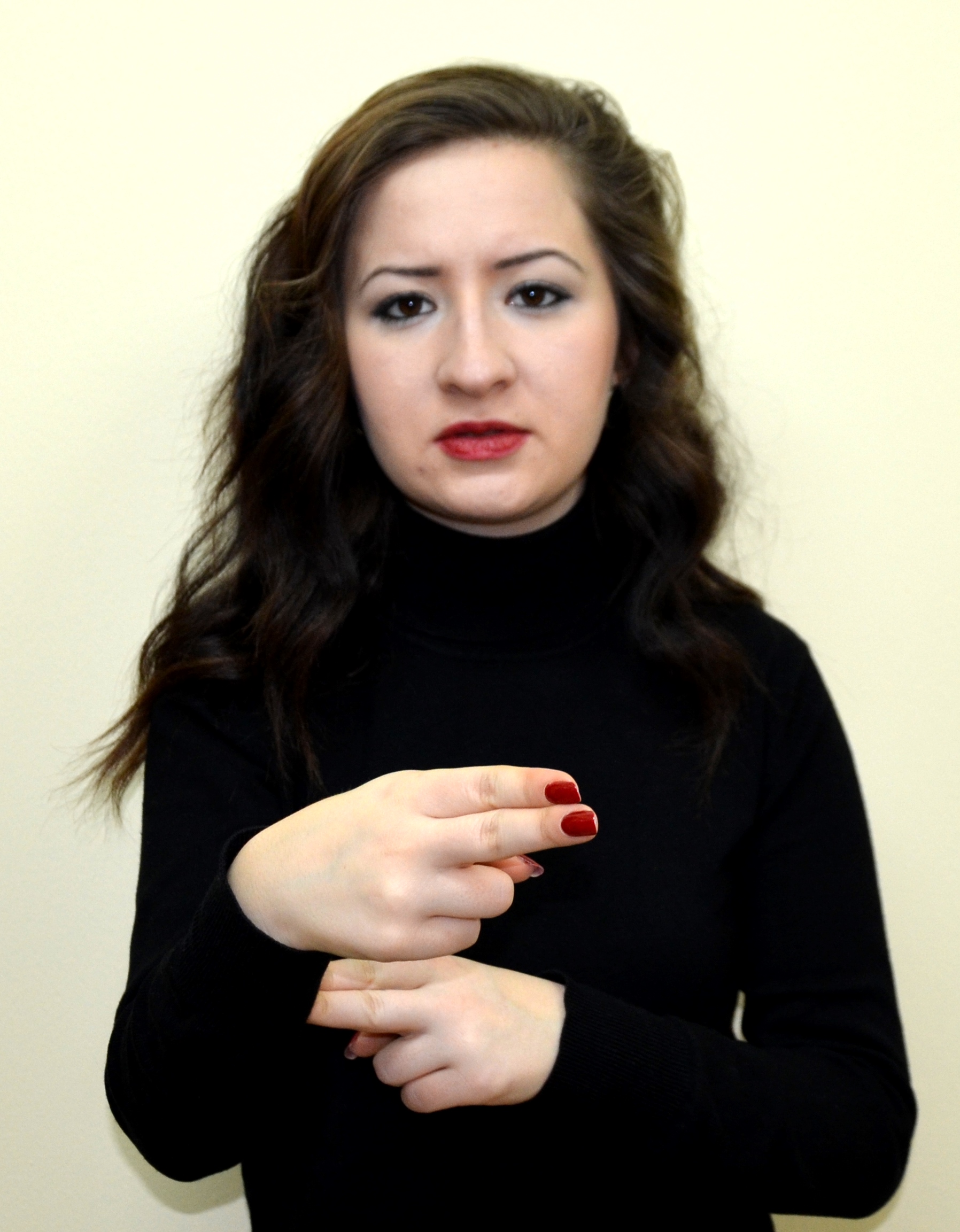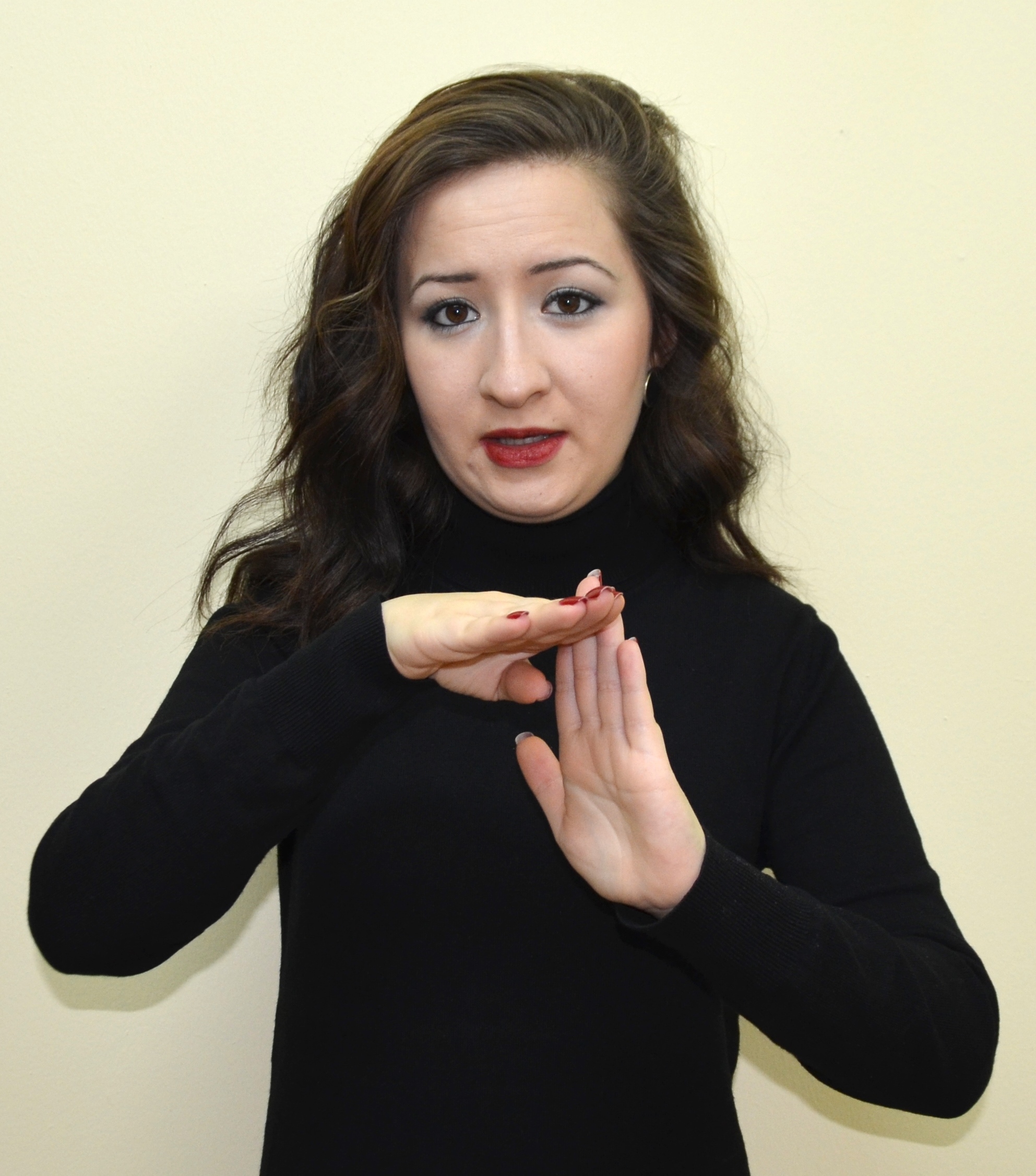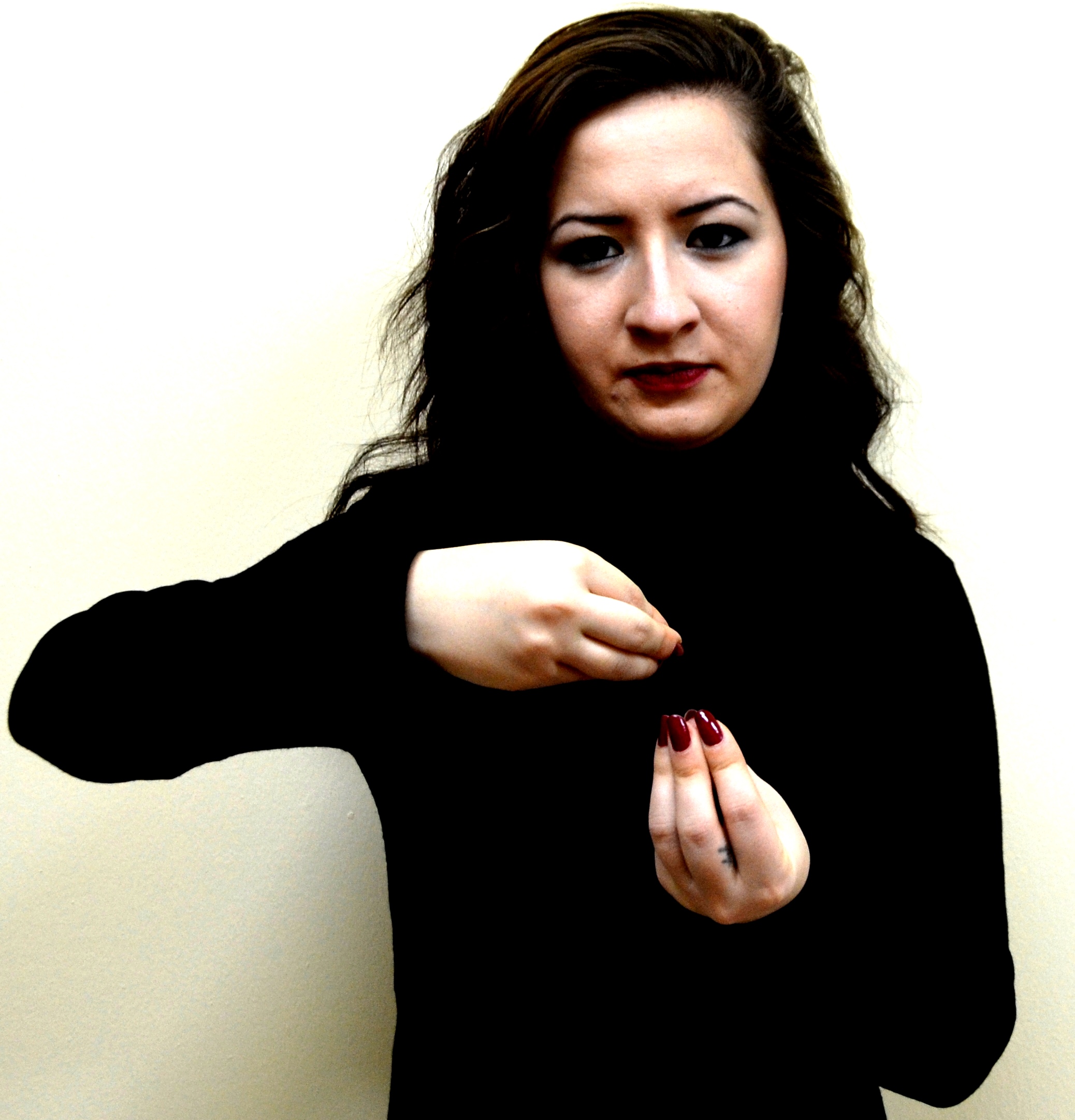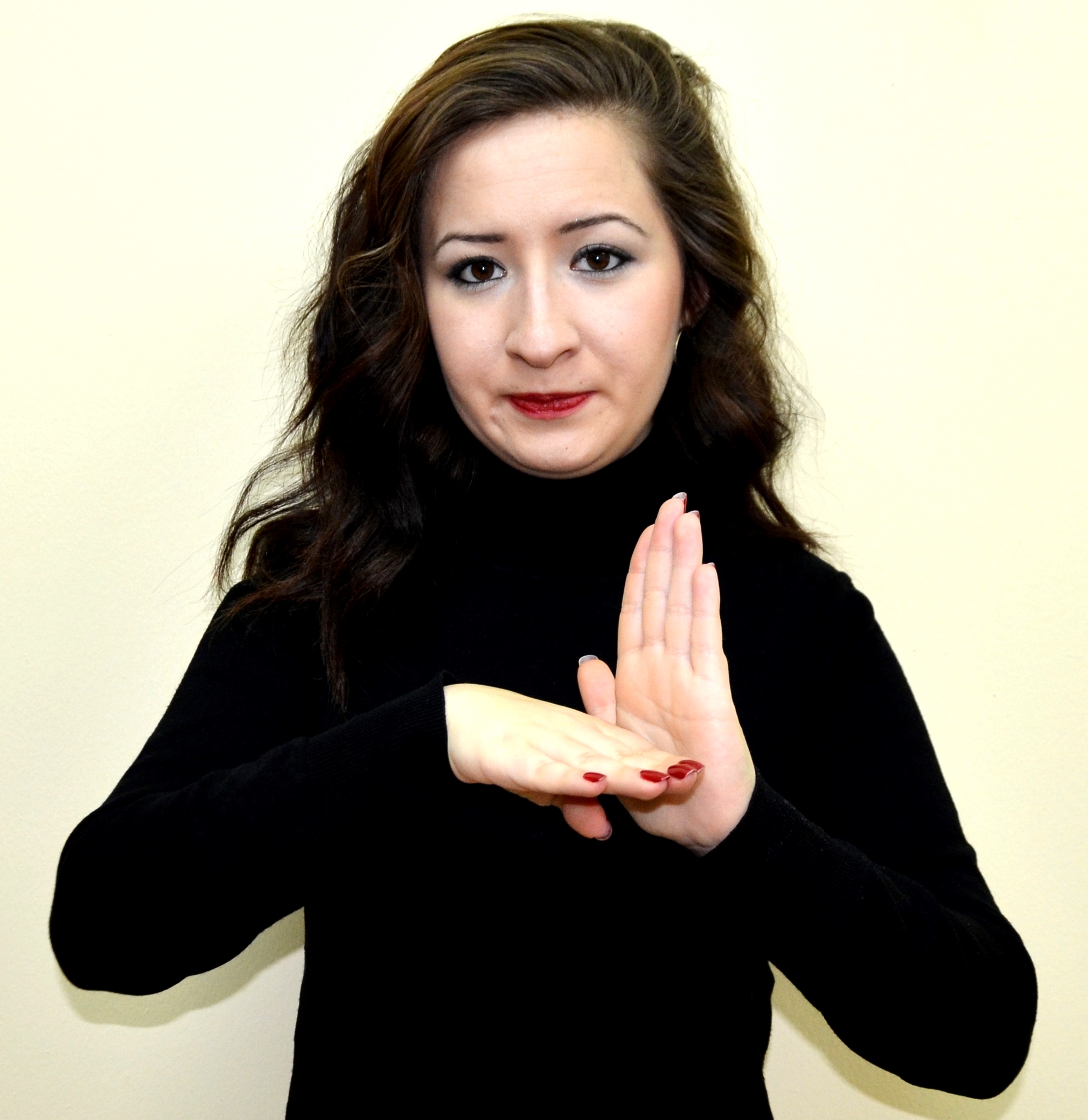 İki el göğüs hizasındadır. Sağ elin işaret parmağı açık, öbür parmakları kapalıdır. Sol el düz, avuç içi sağa bakacak şekilde tutulur. Sağ elin işaret parmağı, sol avuç içine dokunarak parmak uçlarına doğru hareket ettirilir.