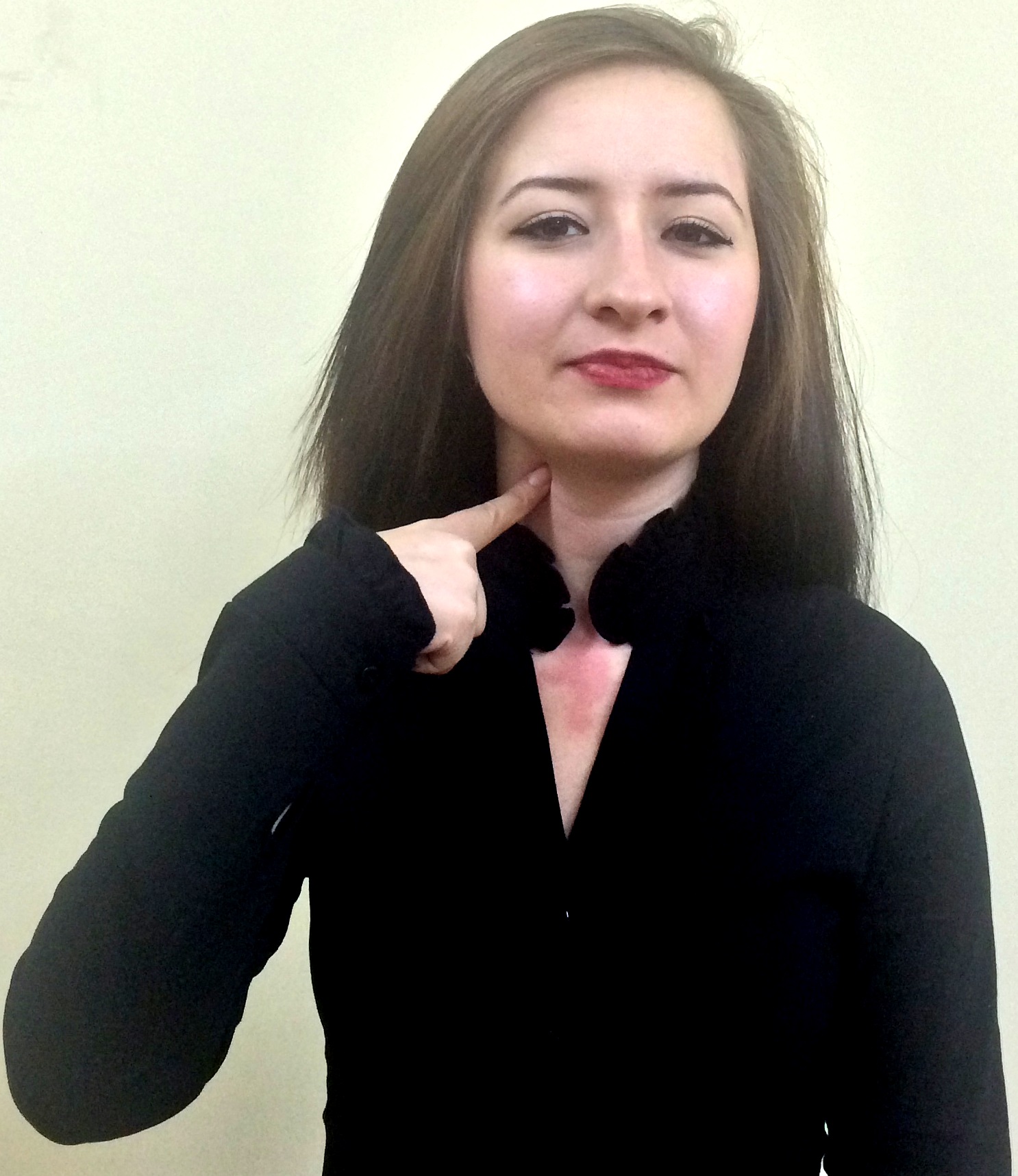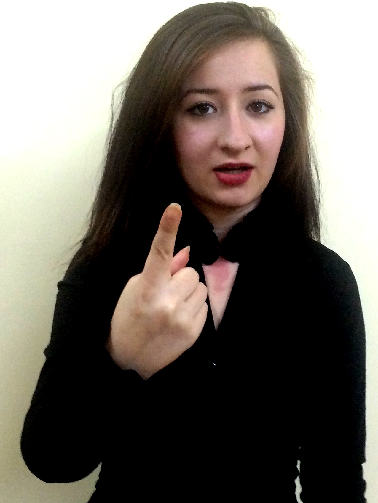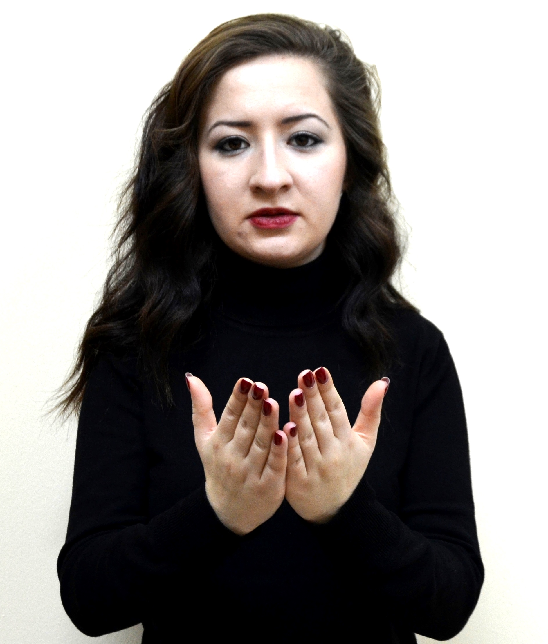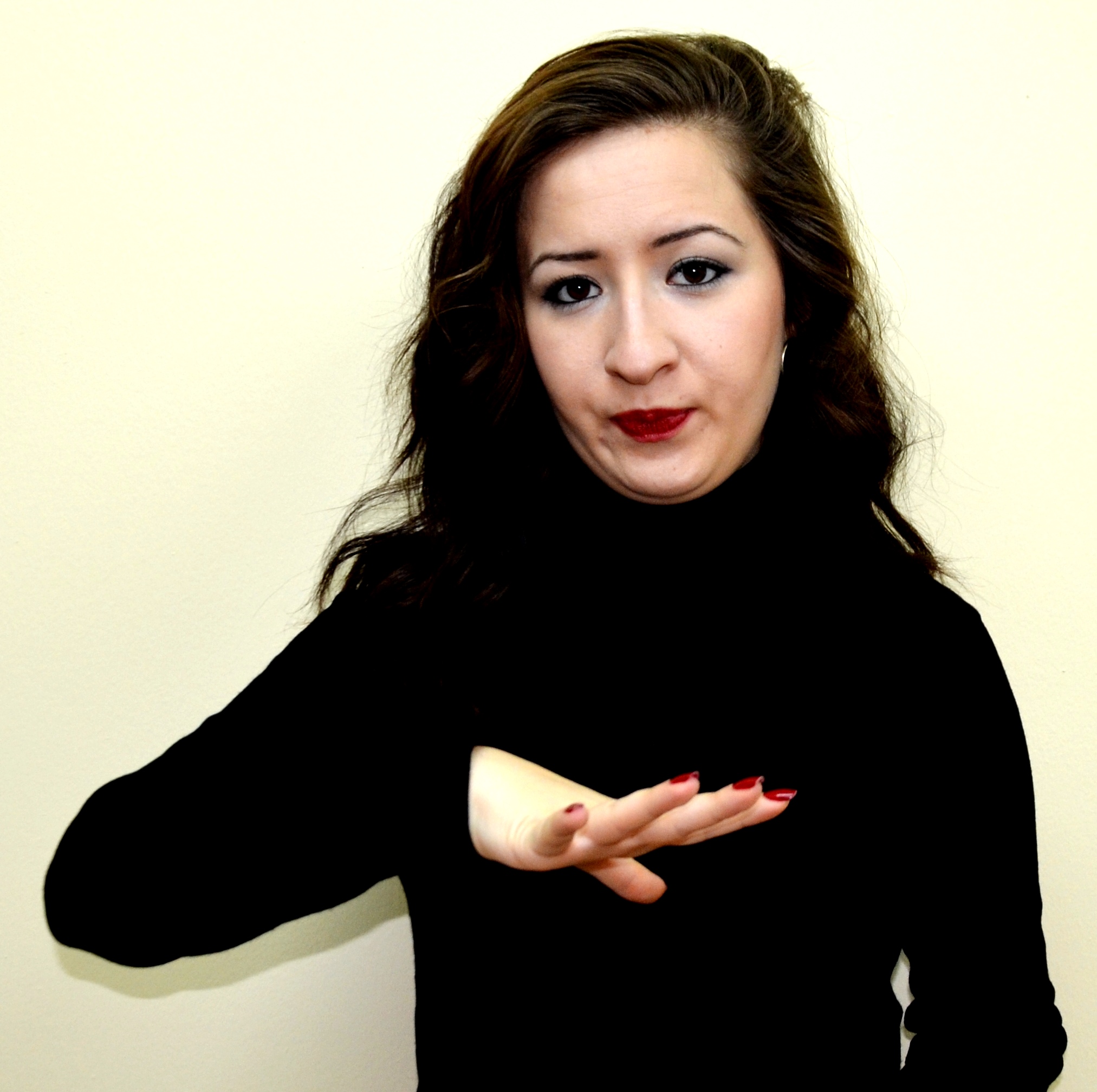 İki el göğüs hizasındadır. Sağ elin işaret parmağı açık, öbür parmakları kapalıdır. Sol el düz, avuç içi sağa bakacak şekilde tutulur. Sağ elin işaret parmağı, sol avuç içine dokunarak parmak uçlarına doğru hareket ettirilir.