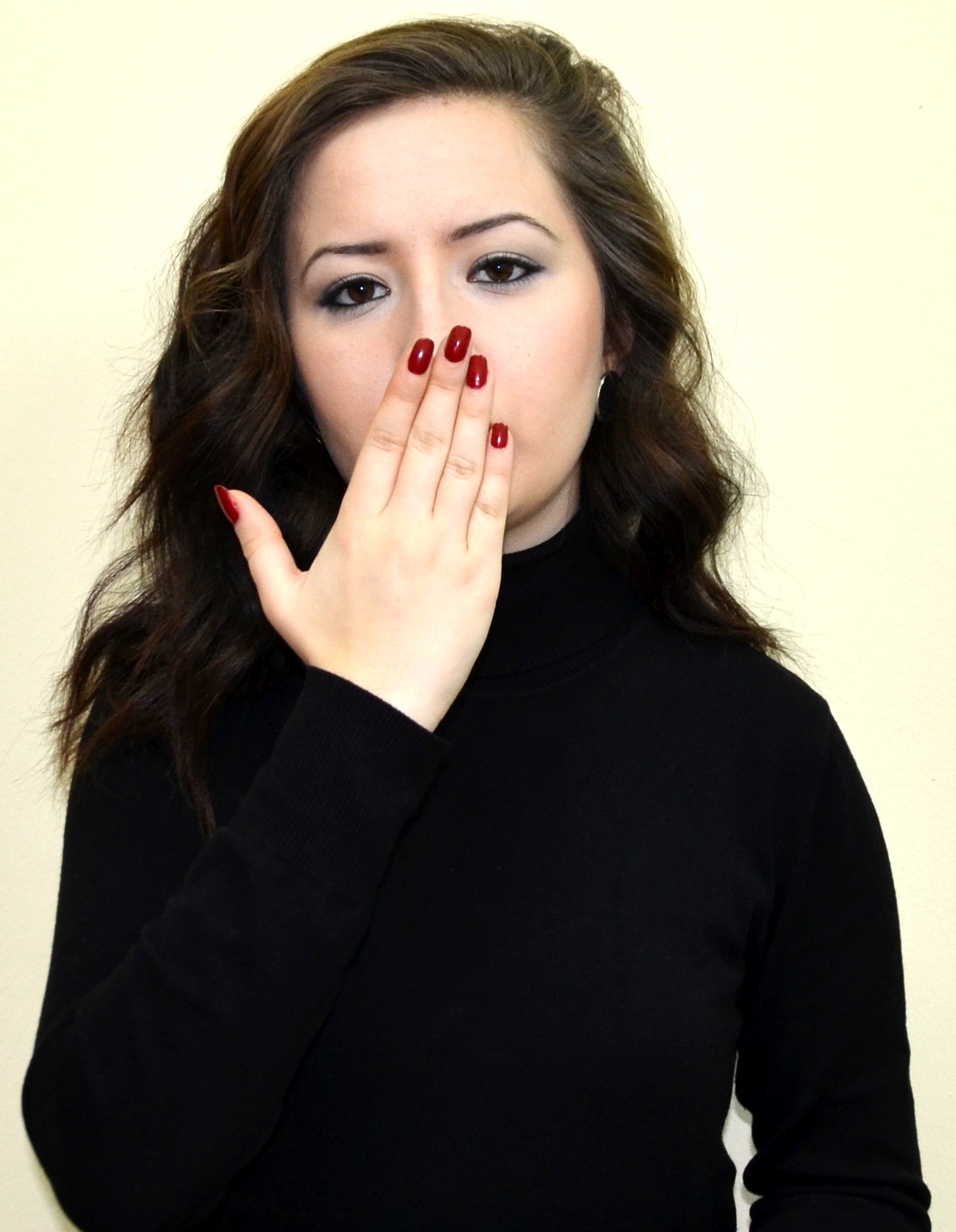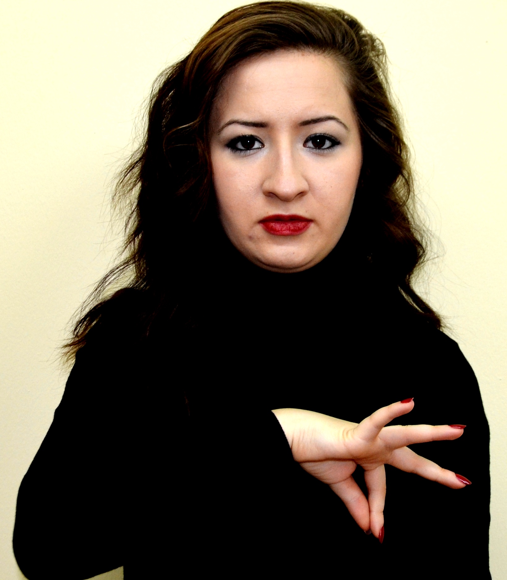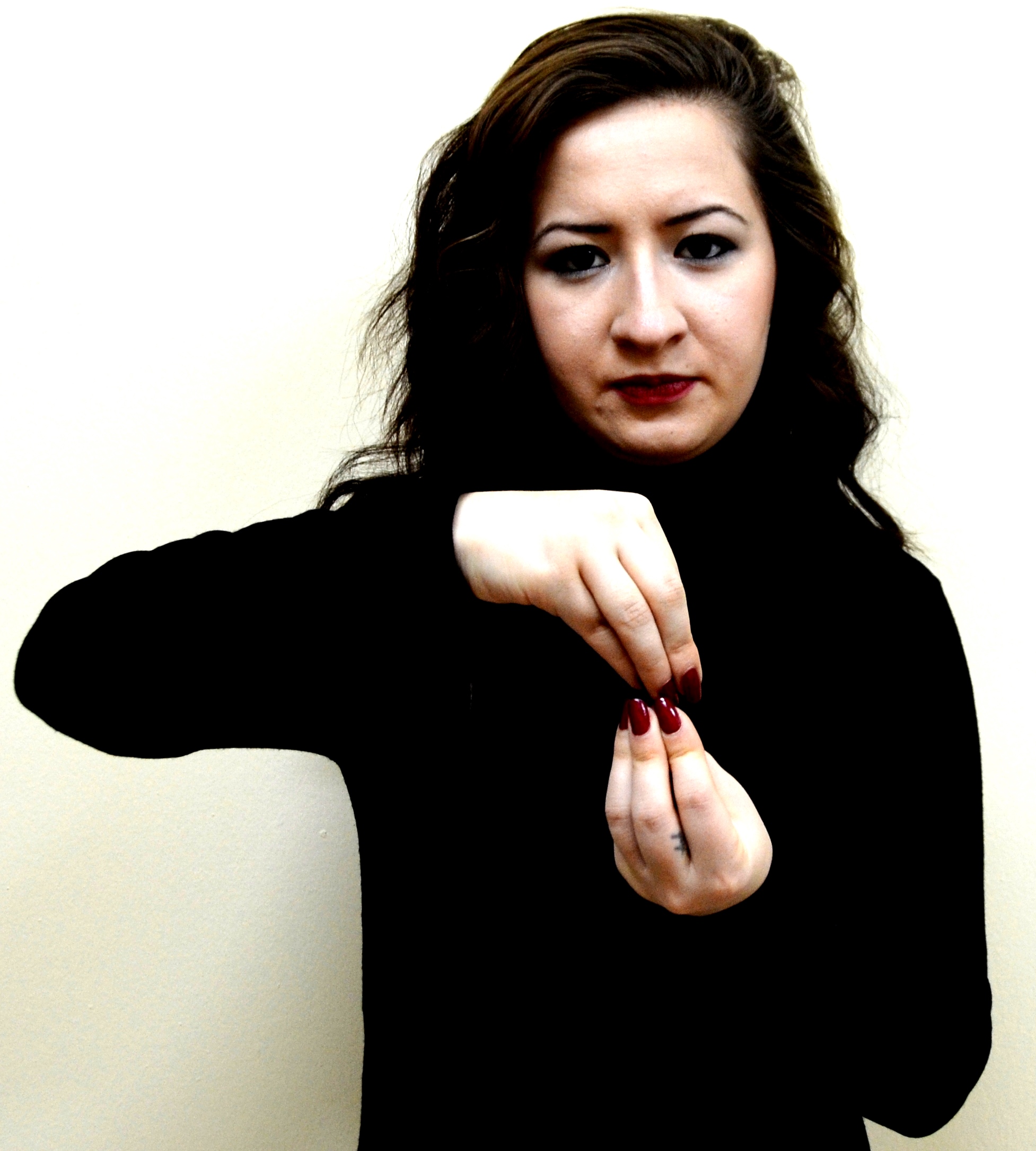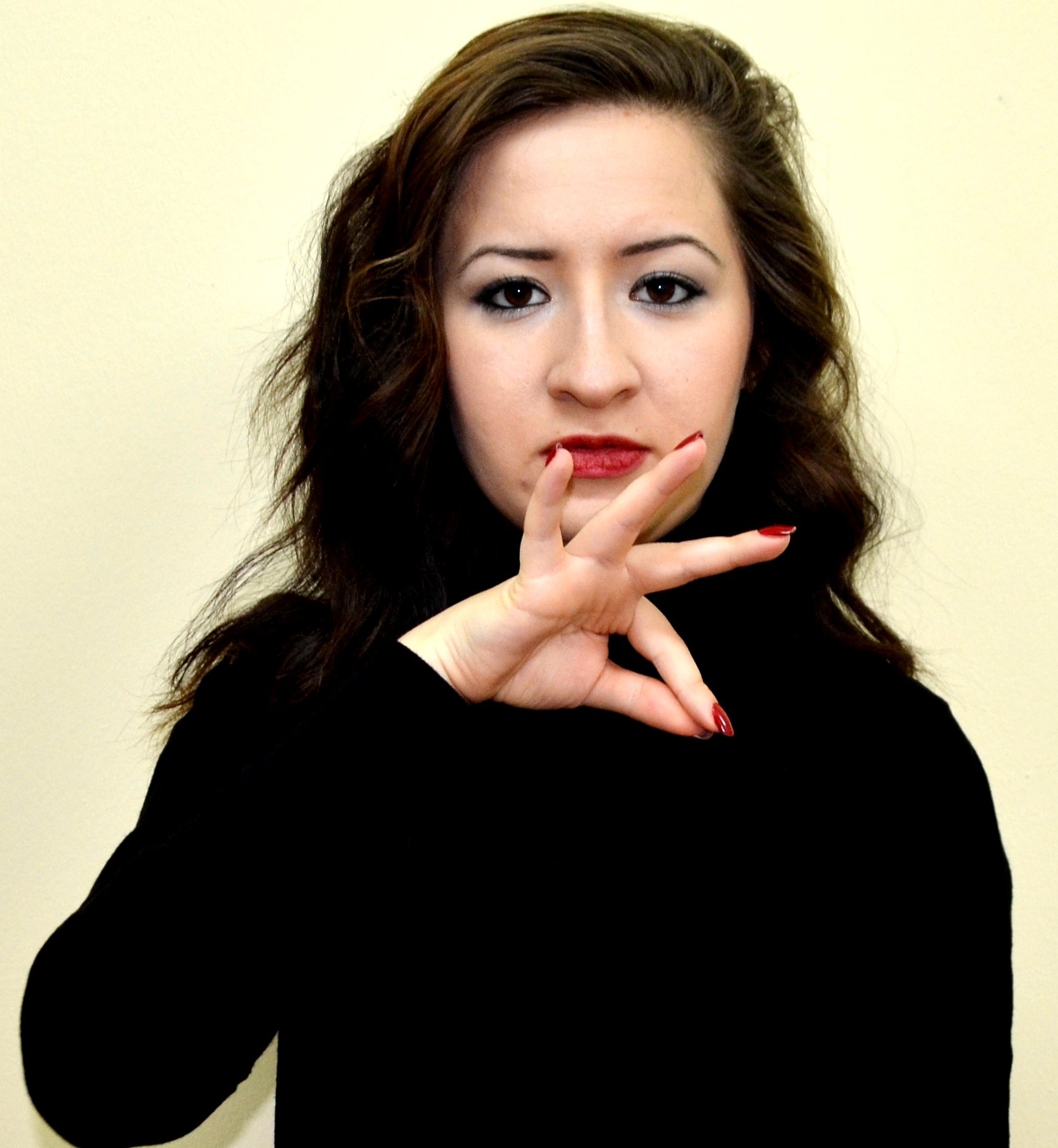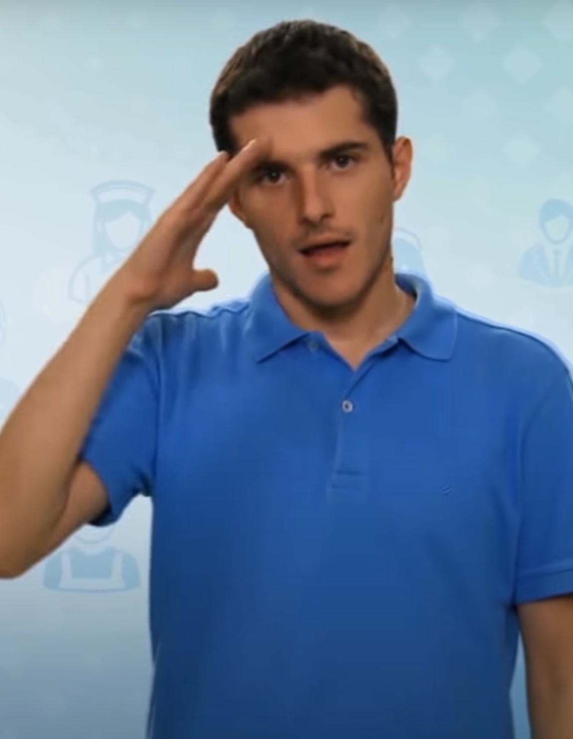 İki el göğüs hizasındadır. Sağ elin işaret parmağı açık, öbür parmakları kapalıdır. Sol el düz, avuç içi sağa bakacak şekilde tutulur. Sağ elin işaret parmağı, sol avuç içine dokunarak parmak uçlarına doğru hareket ettirilir.