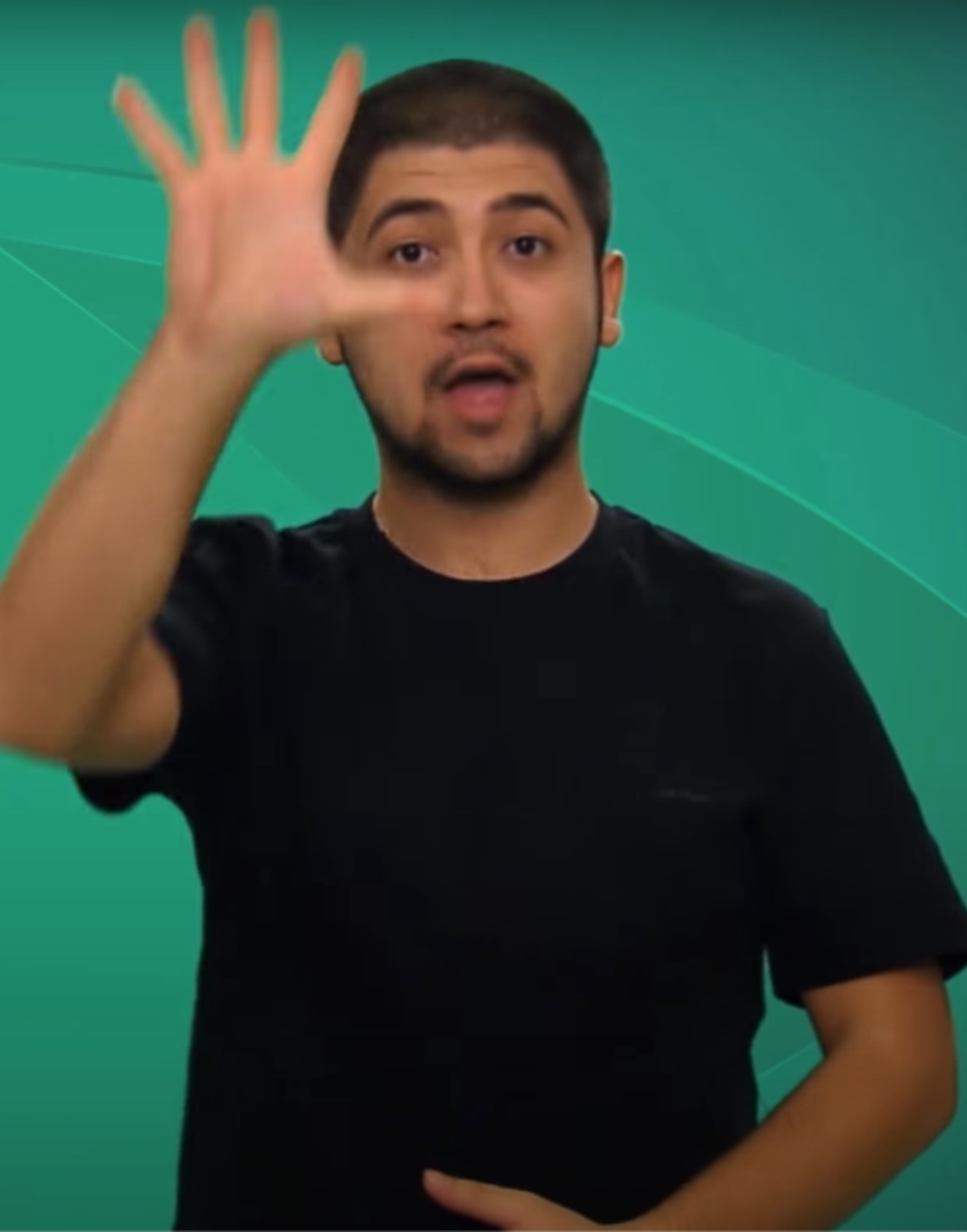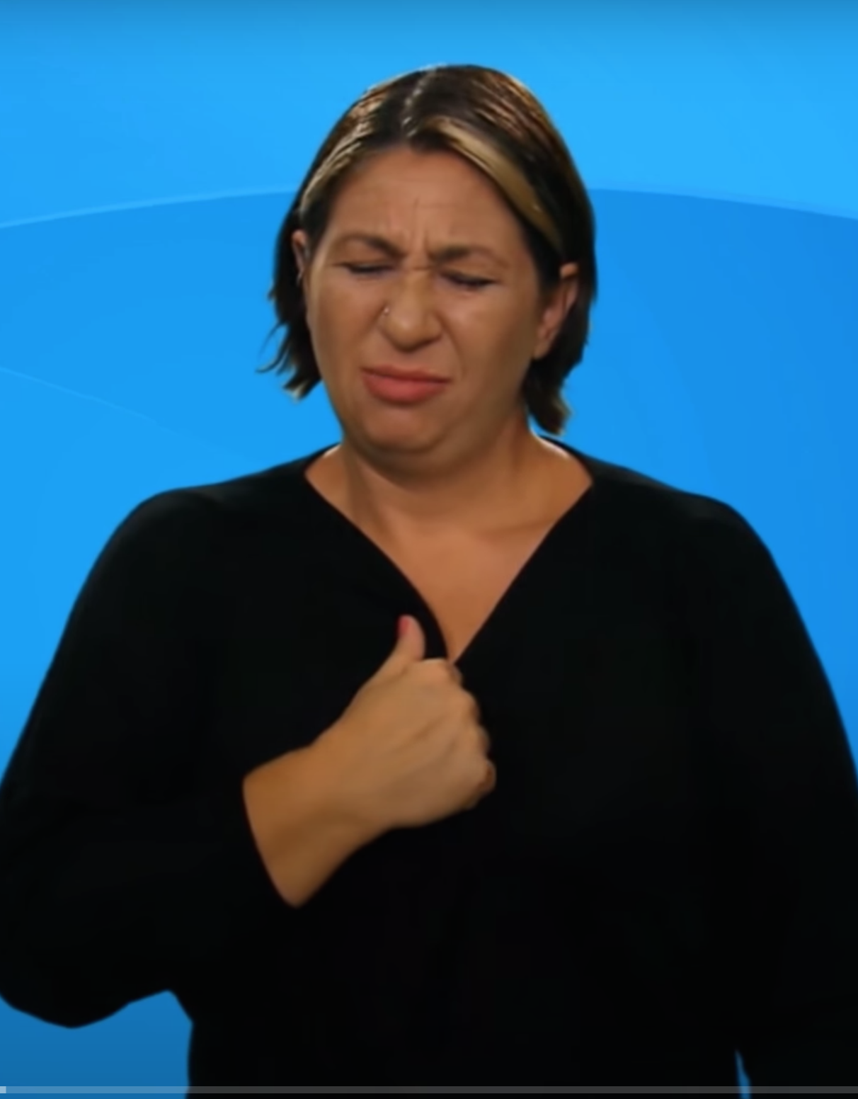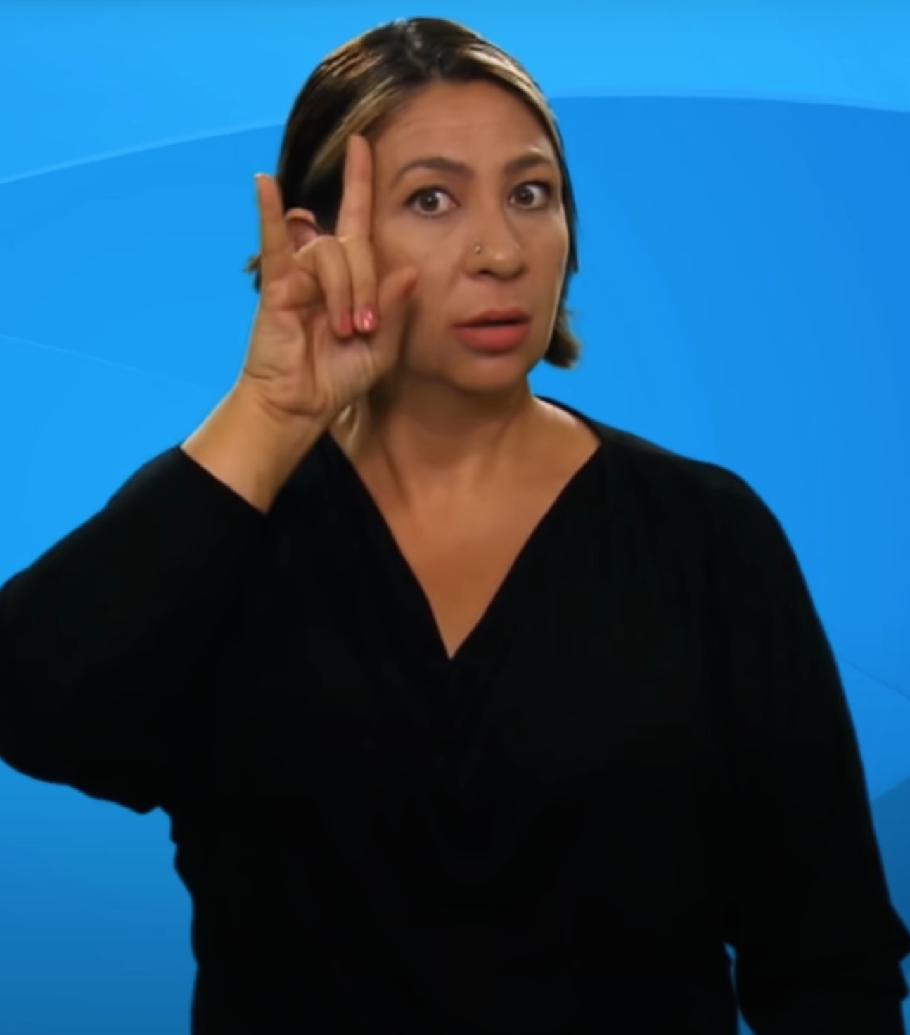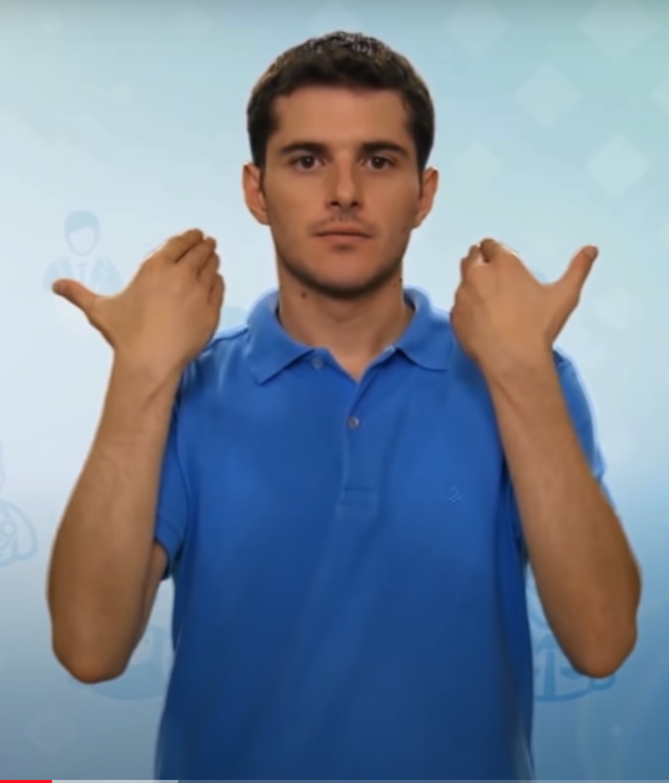 “İki elin işaret parmakları açık, diğer parmaklar kapalıdır. Açık parmaklar göğüs hizasından parmak uçları aşağıyı gösterecek şekilde tek hareketle hareket eder.”
