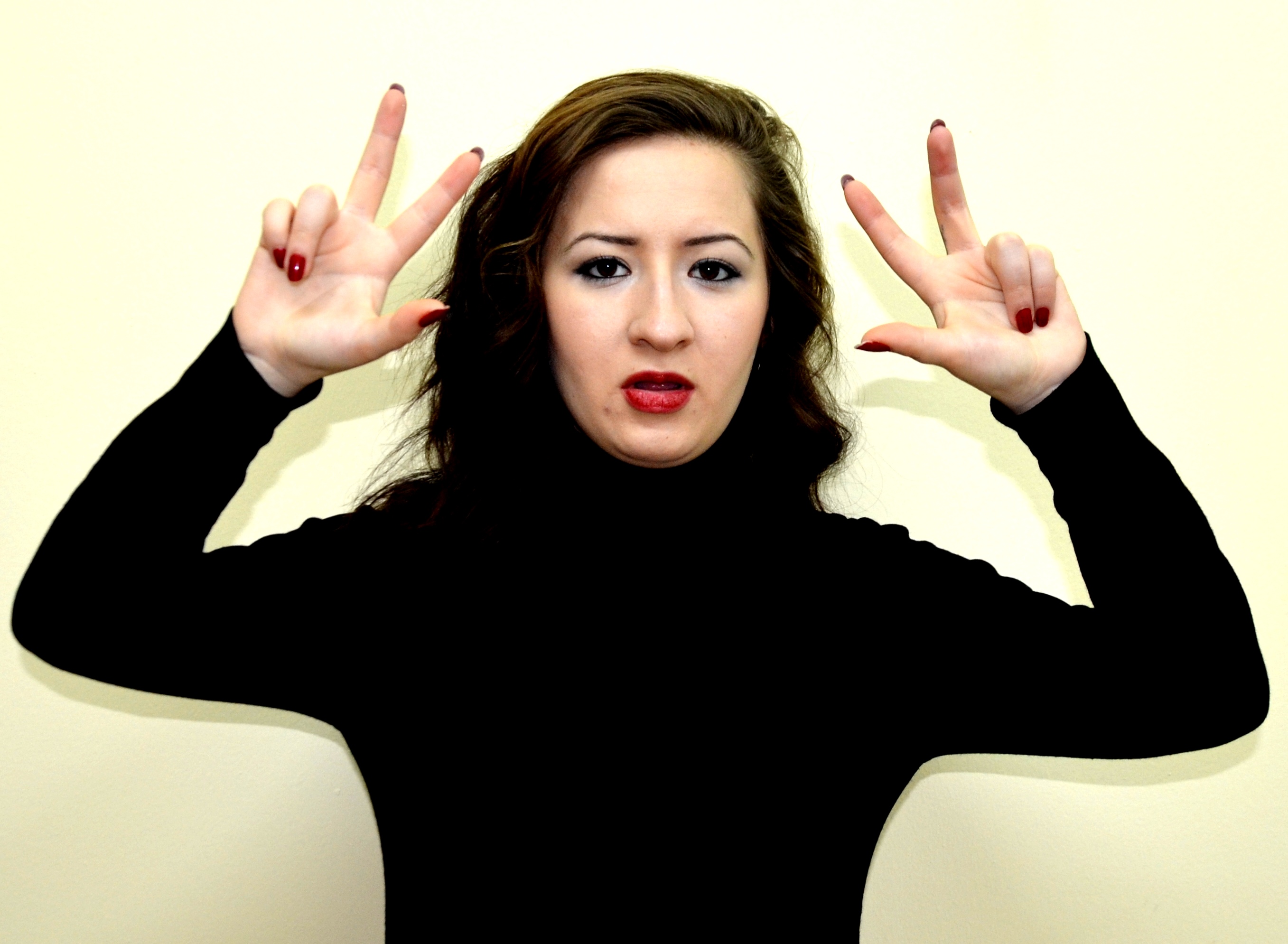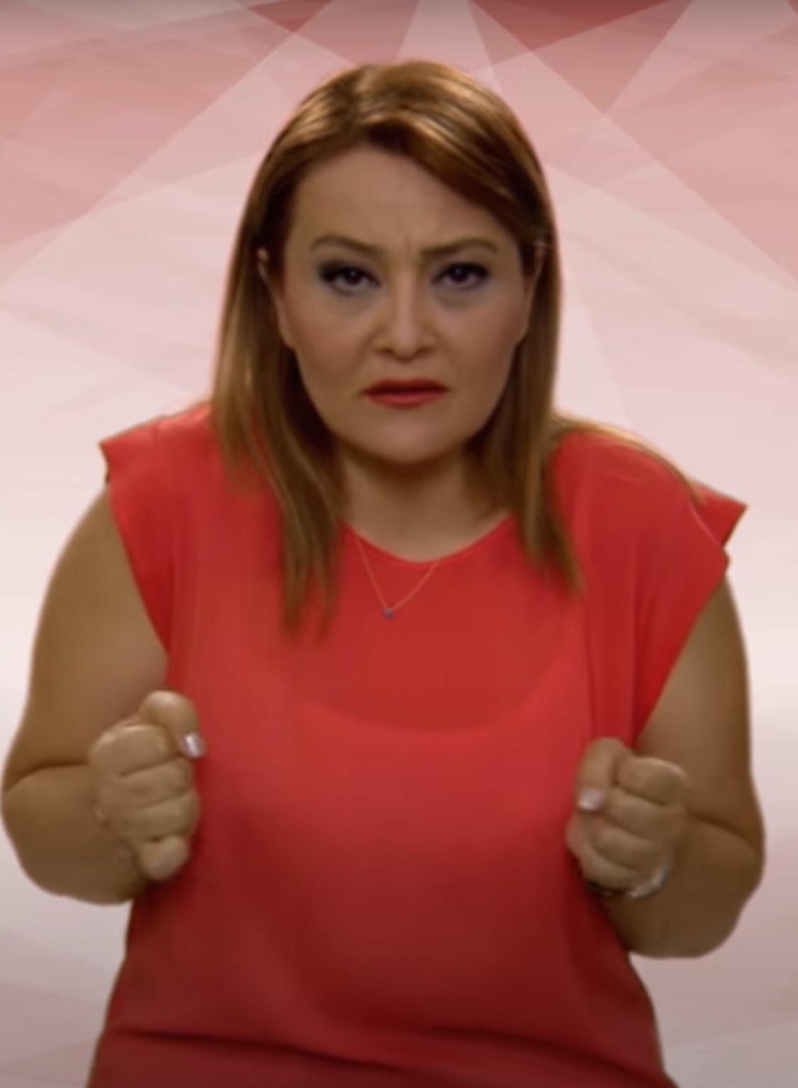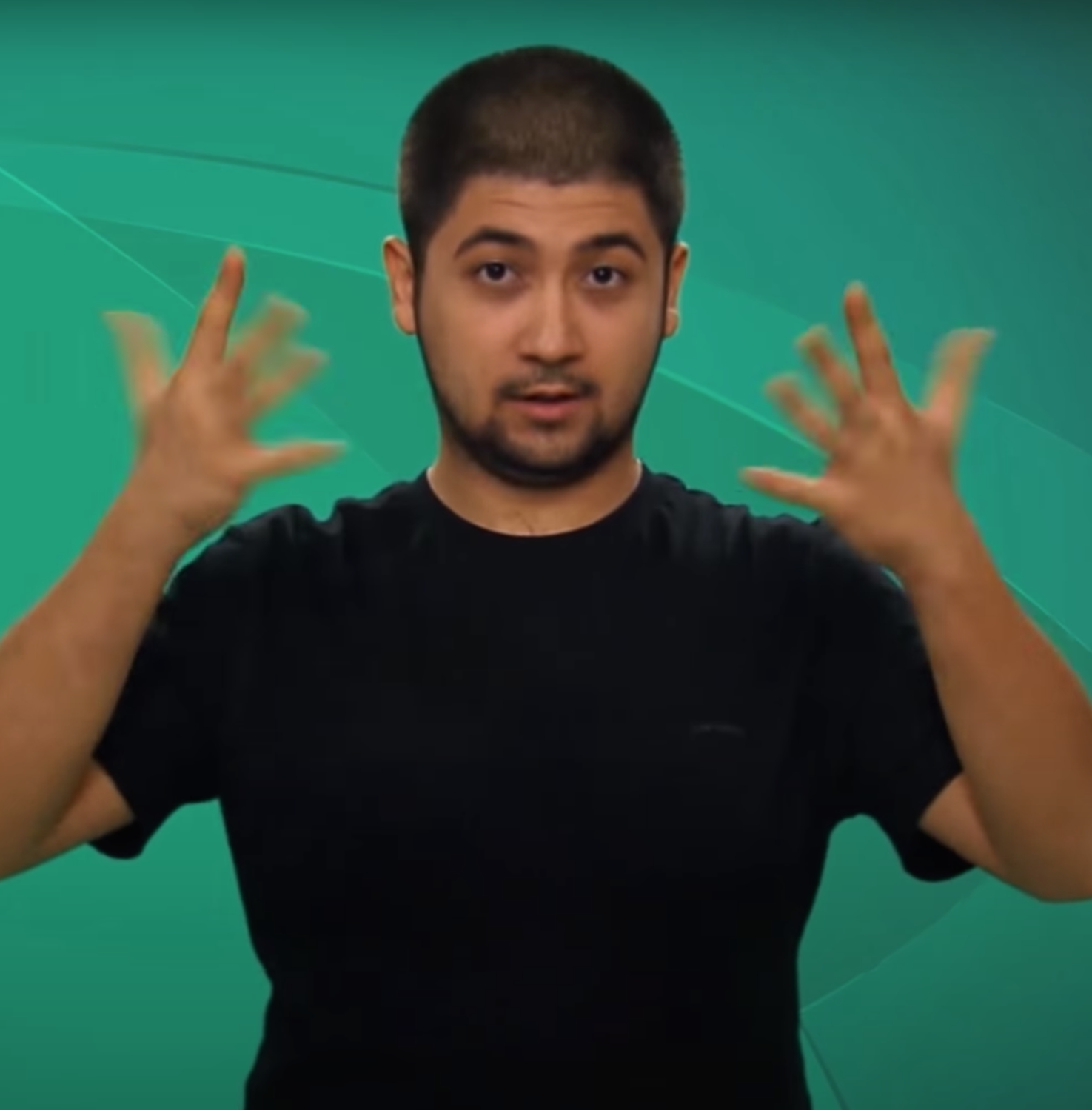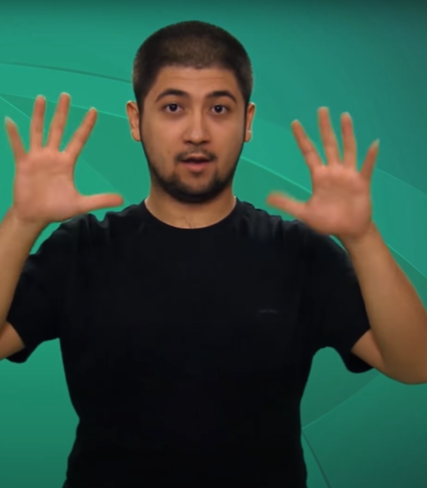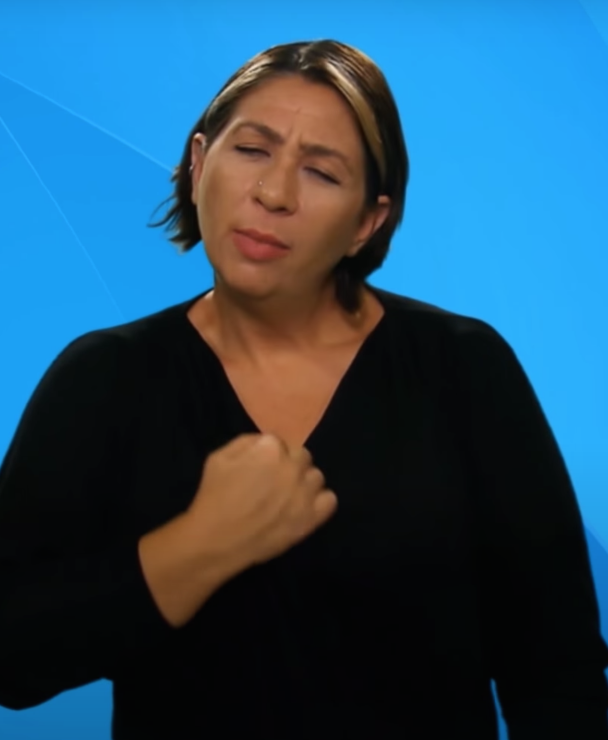 “İki elin işaret parmakları açık, diğer parmaklar kapalıdır. Açık parmaklar göğüs hizasından parmak uçları aşağıyı gösterecek şekilde tek hareketle hareket eder.”