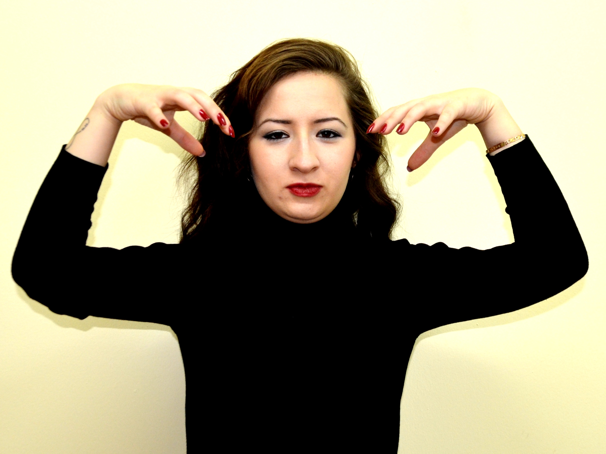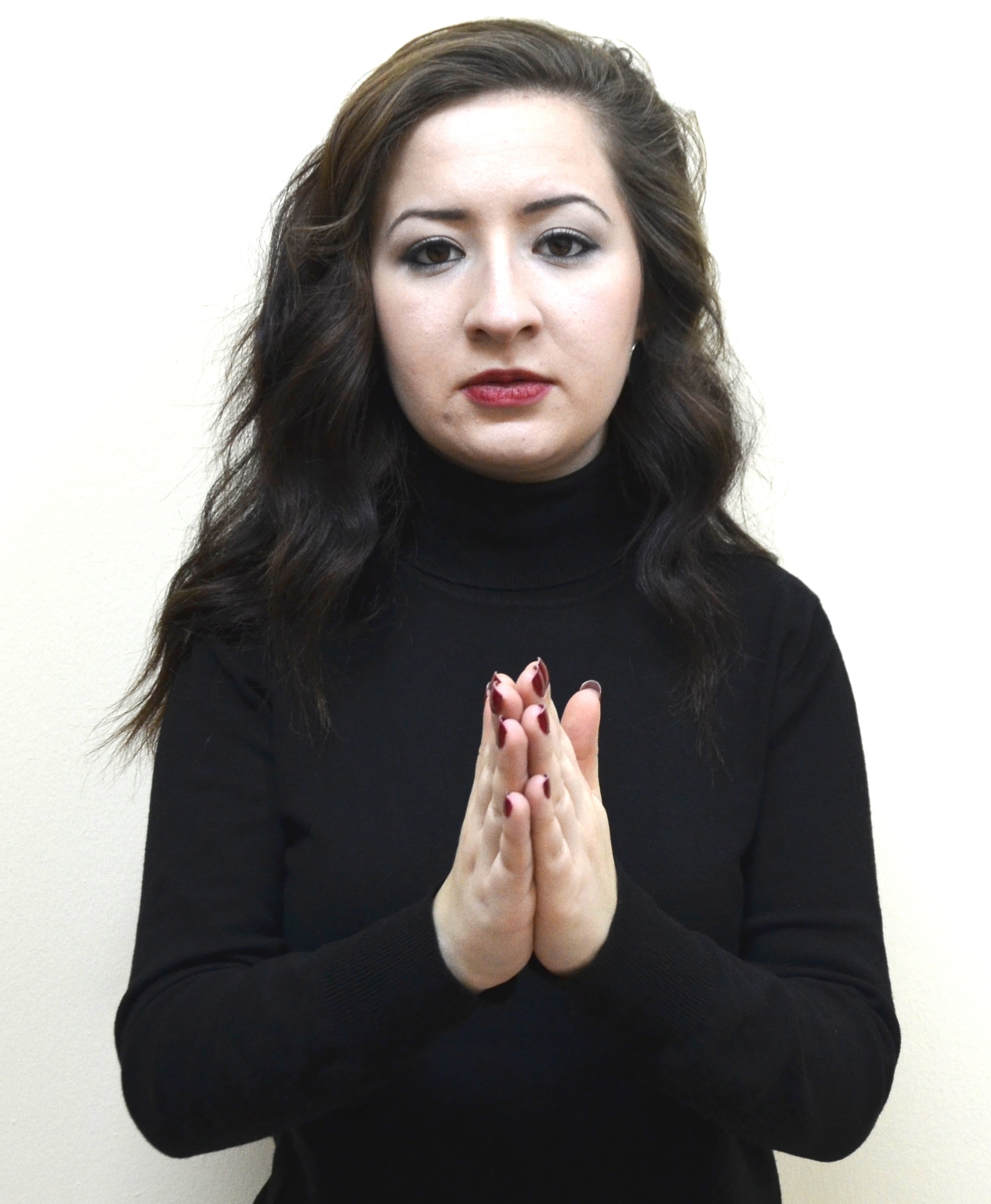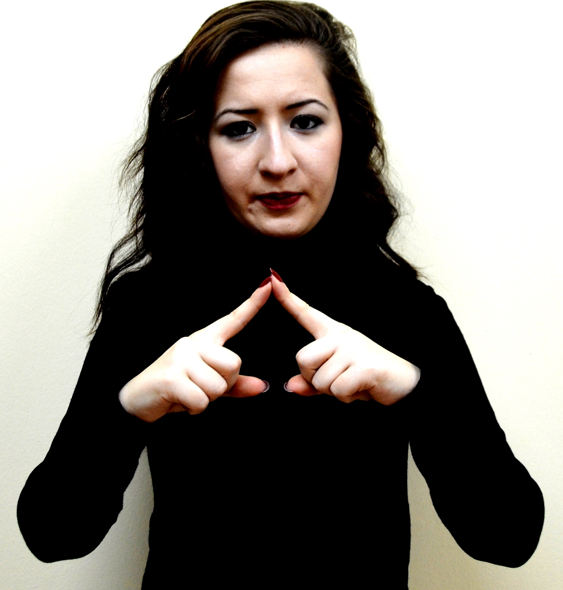 Her iki el serçe parmakları açık, öbür parmaklar kapalı, eller iki yandan ortaya getirilir ve parmak uçları birleştirilir.