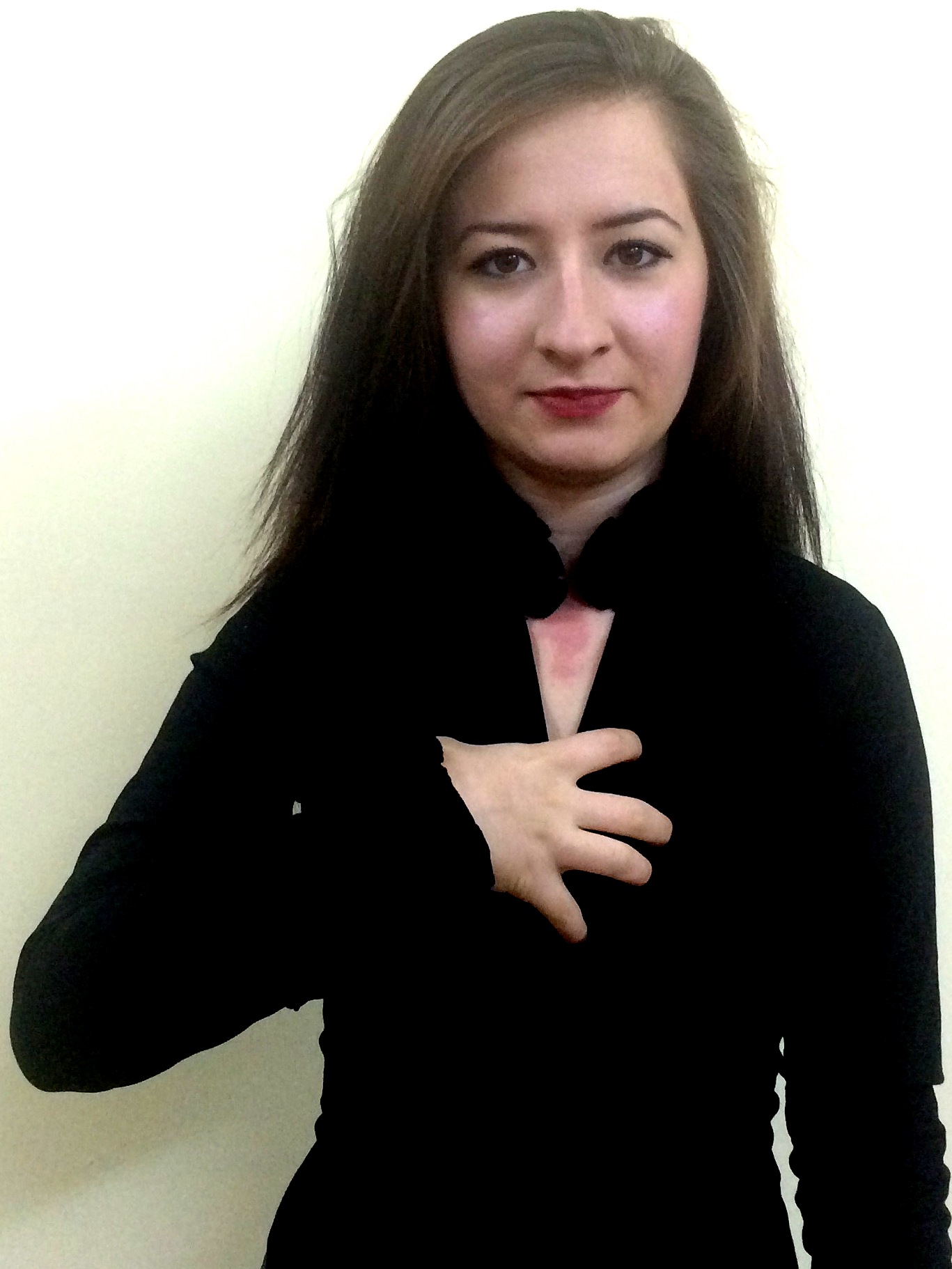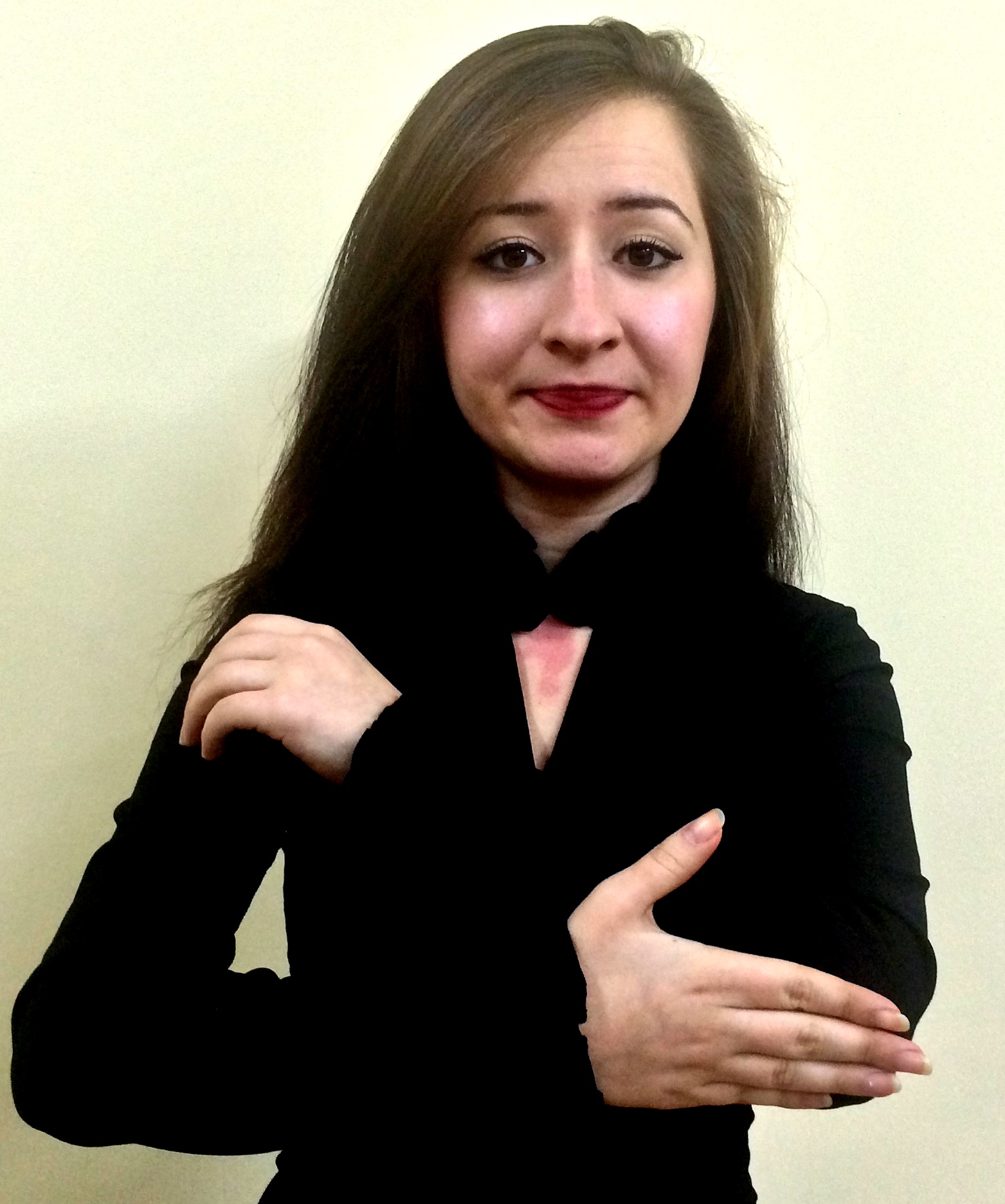 İki el göğüs hizasında, parmaklar açık ve avuç içleri karşıya bakacak şekilde, sağ el altta, sol el üstte başlar ve eller iki yana açılarak bitirilir.