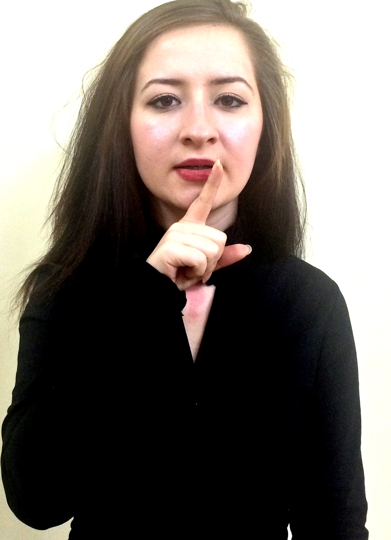 Sağ elin işaret ve orta parmakları açık ve düz, öbür parmaklar kapalıdır. Açık parmaklar çenenin üzerine konur.