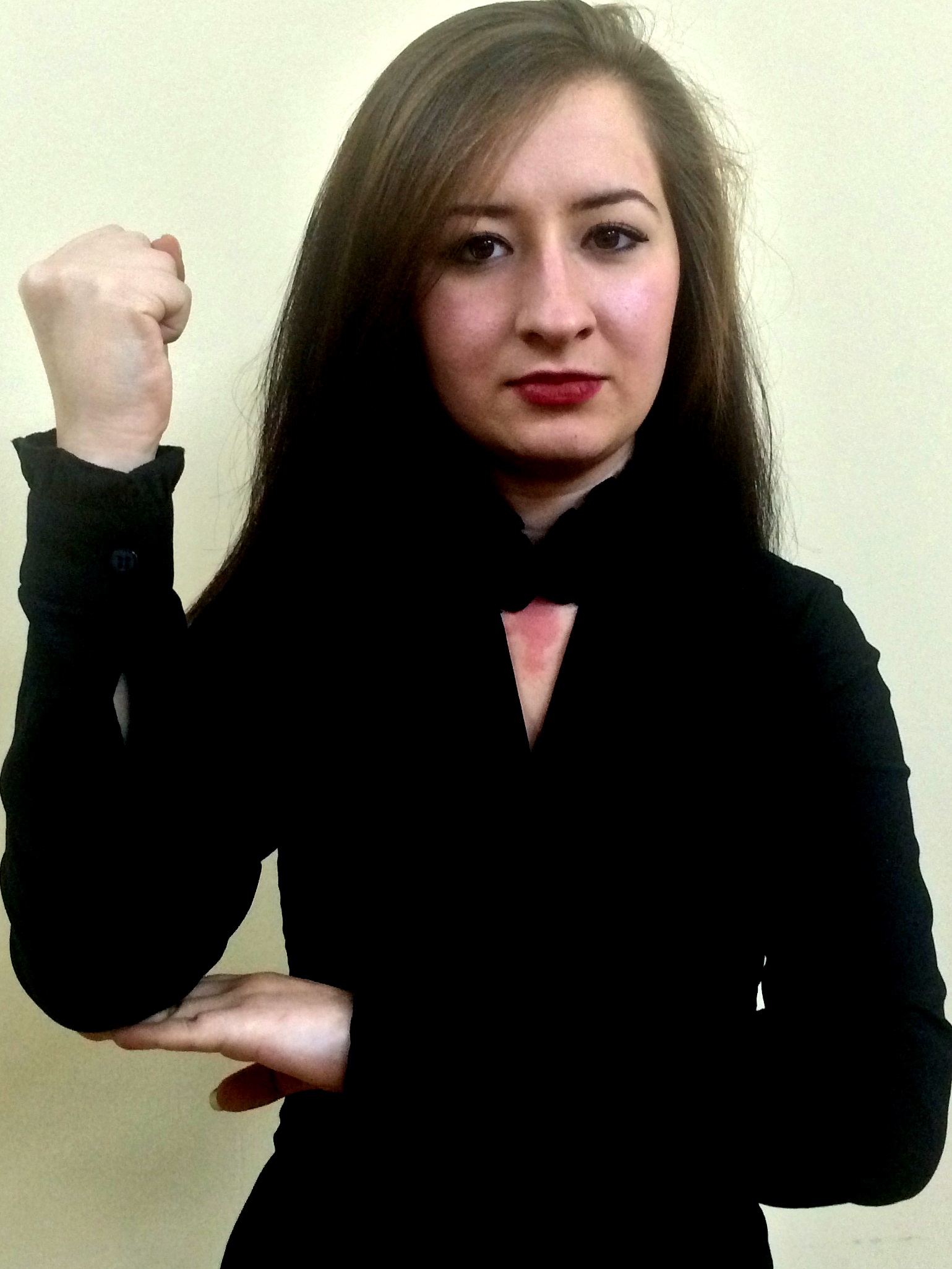 İki el göğüs hizasında, parmaklar kapalı ve yumruklar karşıya bakacak şekilde, sağ el üstte, sol el altta başlar ve eller iki yana açılarak bitirilir.