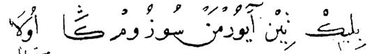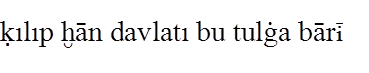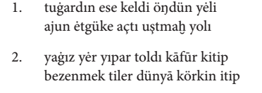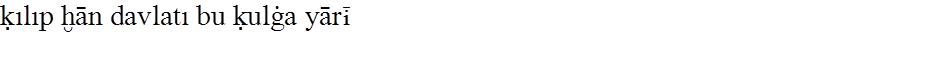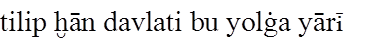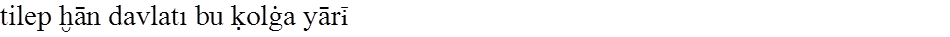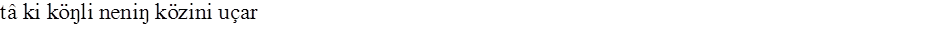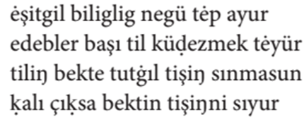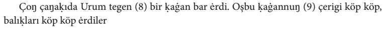 Gene bu çaḳ- (8) da oñ çañaḳda altun ḳaġan (9) tegen bir ḳaġan bar ėrdi. Oşbu Altun 14 (1) Ḳaġan Oġuz Ḳaġanġa ėlçi yumşap (2) yiberdi. Köp telim altun kümüş tartıp, köp telim (3) ḳız yaḳut taş alıp, köp telim erdiniler yiber- (4) ip yumşap, Oġuz Ḳaġanġa suyurḳap (5) bėrdi; aġızıġa baḳındı. Yaḳşı bigü birle (6) dostluḳ ḳıldı. Anuñ birle amıraḳ (7) boldı.