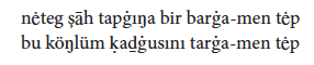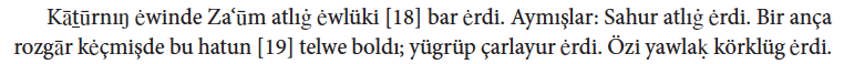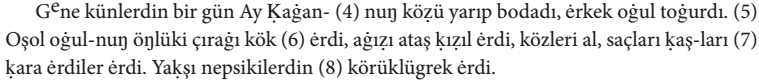 Gene künlerdin bir gün Ay Ḳaġan- (4) nuñ közü yarıp bodadı, ėrkek oġul toġurdı. (5) Oşol oġul-nuñ öñlüki çıraġı kök (6) ėrdi, aġıẓı ataş ḳızıl ėrdi, közleri al, saçları ḳaş-ları (7) ḳara ėrdiler ėrdi. Yaḳşı nepsikilerdin (8) körüklügrek ėrdi.