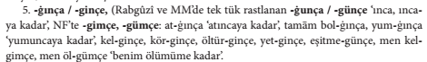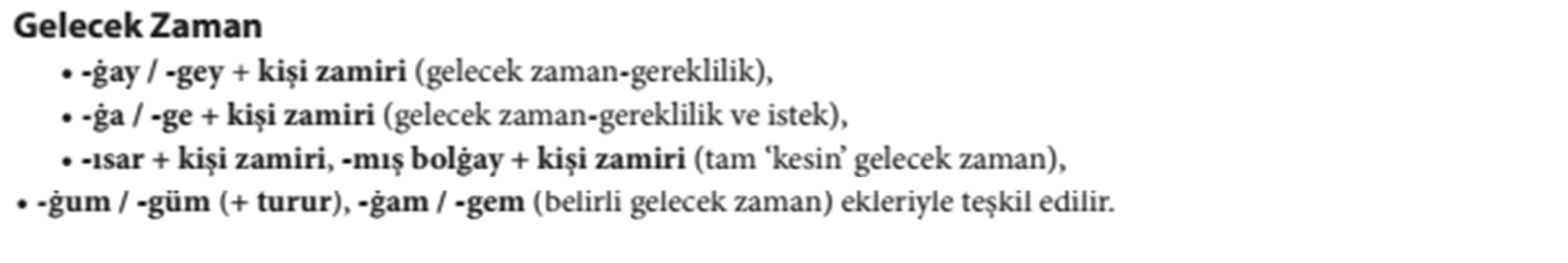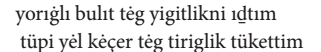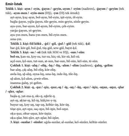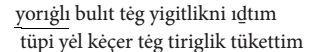Metinde kelgenler, uçkanlar kelimelerinde sıfat-fiil, basup kelimesinde zarf-fiil, yılkılarnı, künlerni, künni kelimelerinde belirtme hâli ve içinde kelimesinde 3. teklik şahıs iyelik eki bulunmaktadır. Metindeki hiçbir kelimede 1. teklik şahıs iyelik eki bulunmaz.