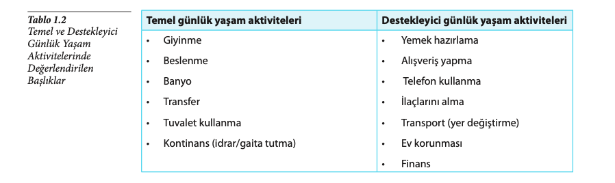 • Günlük yaşam aktivitelerini yerine getirme düzeyi/ yeterliliği,