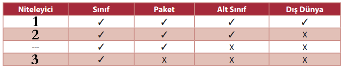 Sarmalama işleminin yapılabilmesi için kullanılan public, private ve protected gibi ifadelere ne ad verilir?