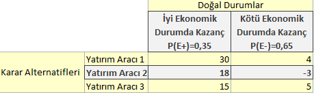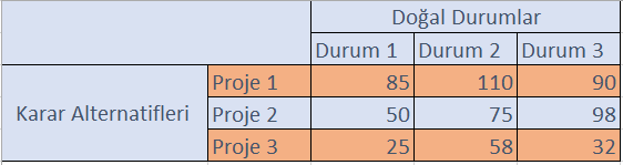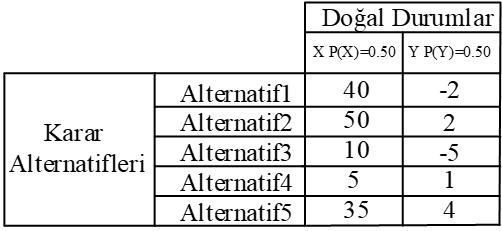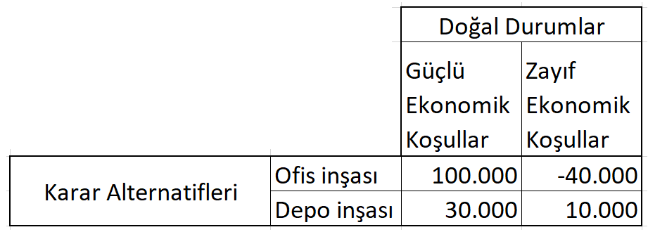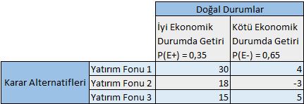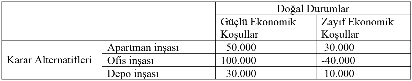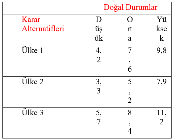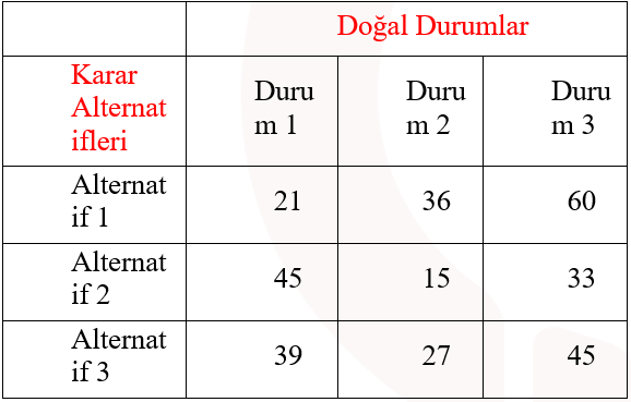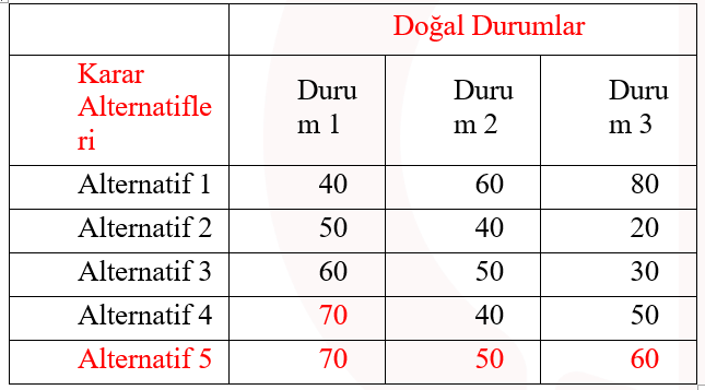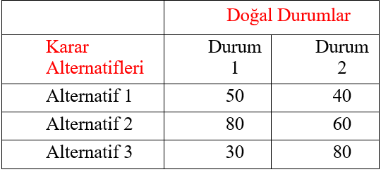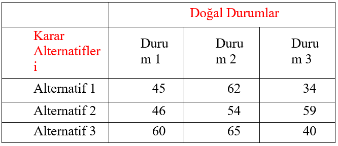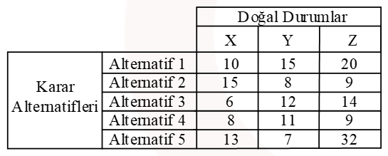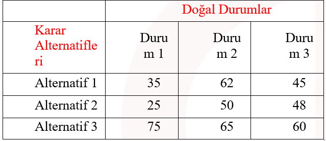 Doğal durumlar karar probleminde karar vericinin kontrolü altında olmayan faktörlerdir. Karar probleminin içinde yer aldığı çevrenin farklı durumlarını ortaya koyarlar. Doğal durumlar (çevresel faktörler) karar sonuçları üzerinde etkili olmaktadır. Doğal durumlar gelecekte ortaya çıkması beklenen gerçek olaylar olmakla birlikte nasıl gerçekleşeceği kesin olarak bilinmeyen olaylardır. ihracat yapacağı ülkenin ekonomik durumu, aynı sektörde faaliyet gösteren işletmelerin stratejileri, siyasi riskler, doğal afetler vb. doğal durumlara örnek olarak gösterilebilir. Doğru cevap E'dir.
