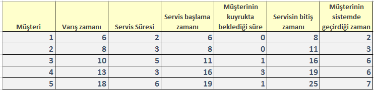 Tek bir veznenin bulunduğu bir bankada, 30 dakika içinde gelen 5 müşteri için oluşturulan benzetim tablosu yukarıdaki gibidir.